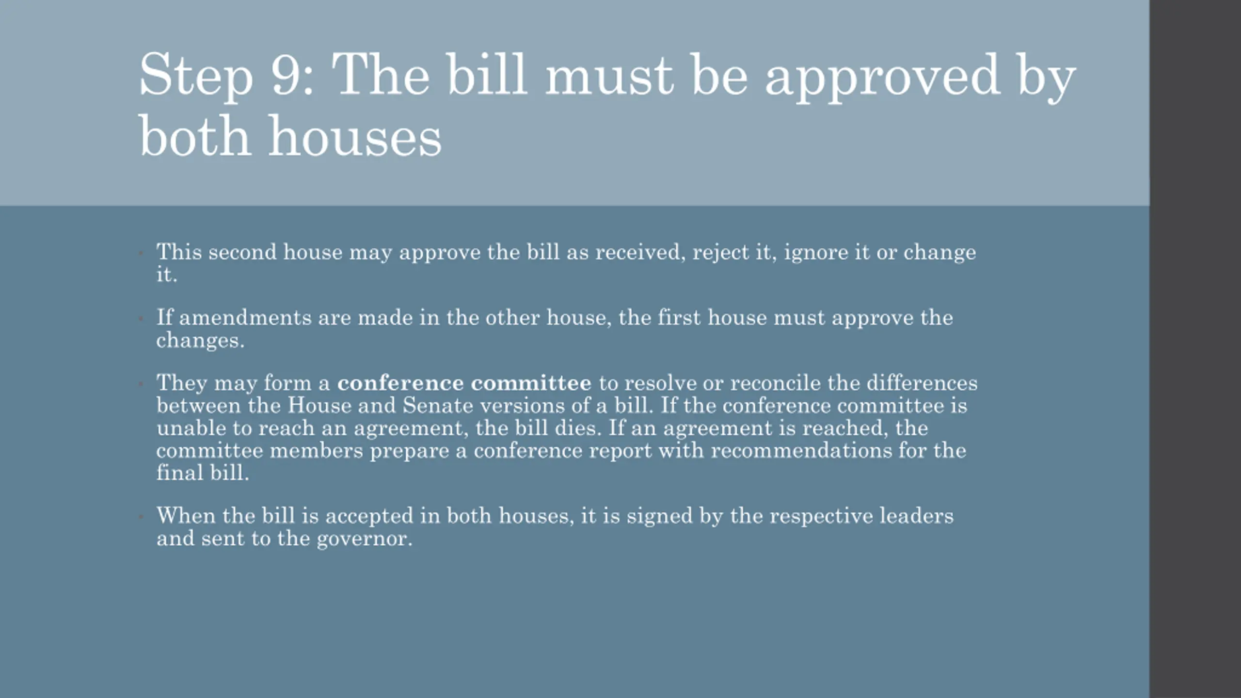 Step 9: The bill must be approved by both houses This second house may approve the bill as received, reject it, ignore it or change it. If amendments are made in the other house, the first house must approve the changes. They may form a conference committee to resolve or reconcile the differences between the House and Senate versions of a bill. If the conference committee is unable to reach an agreement, the bill dies. If an agreement is reached, the committee members prepare a conference report with recommendations for the final bill. When the bill is accepted in both houses, it is signed by the respective leaders and sent to the governor.