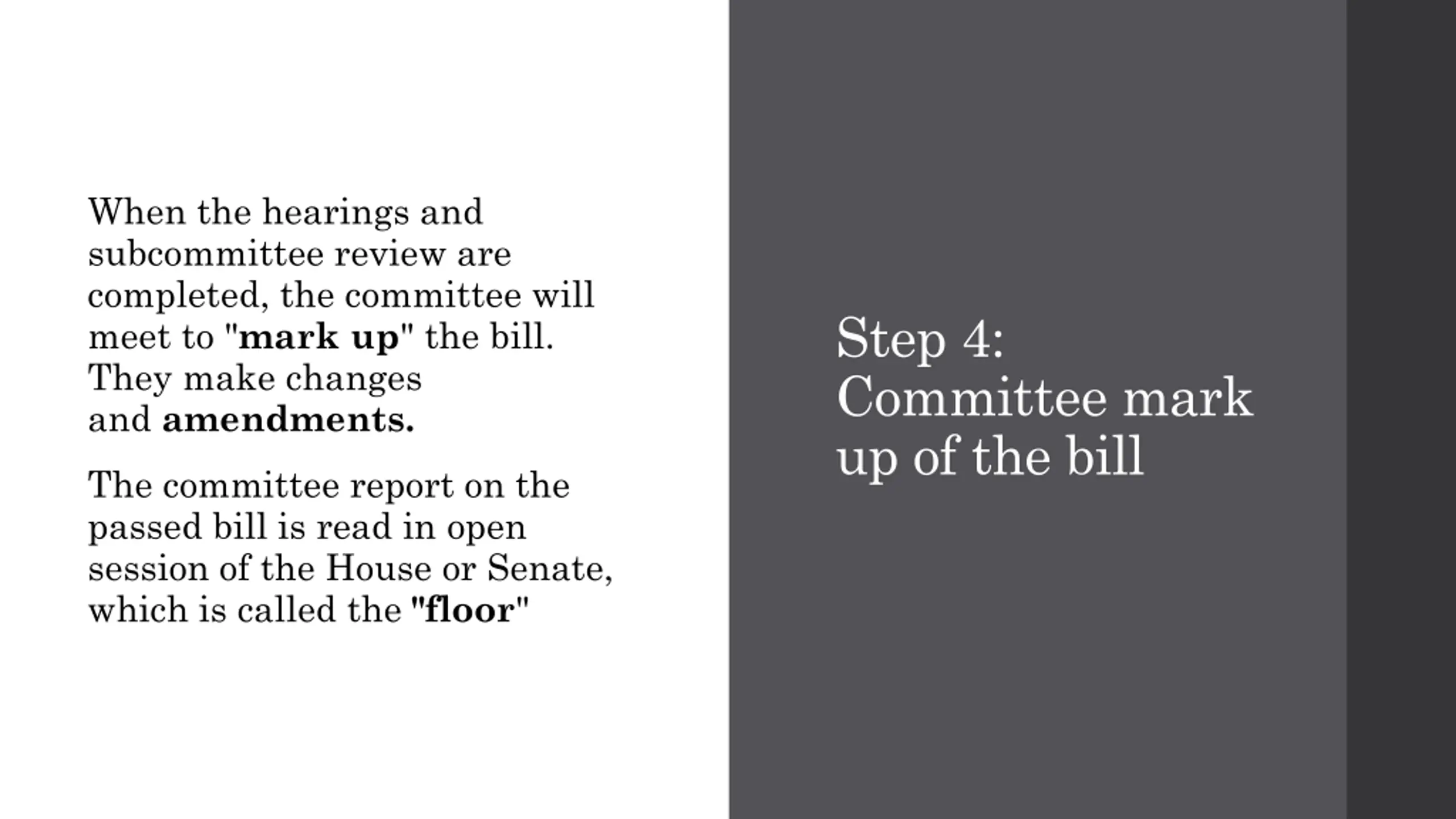 When the hearings and subcommittee review are completed, the committee will meet to "mark up" the bill. They make changes and amendments. Step 4: Committee mark up of the bill The committee report on the passed bill is read in open session of the House or Senate, which is called the "floor"