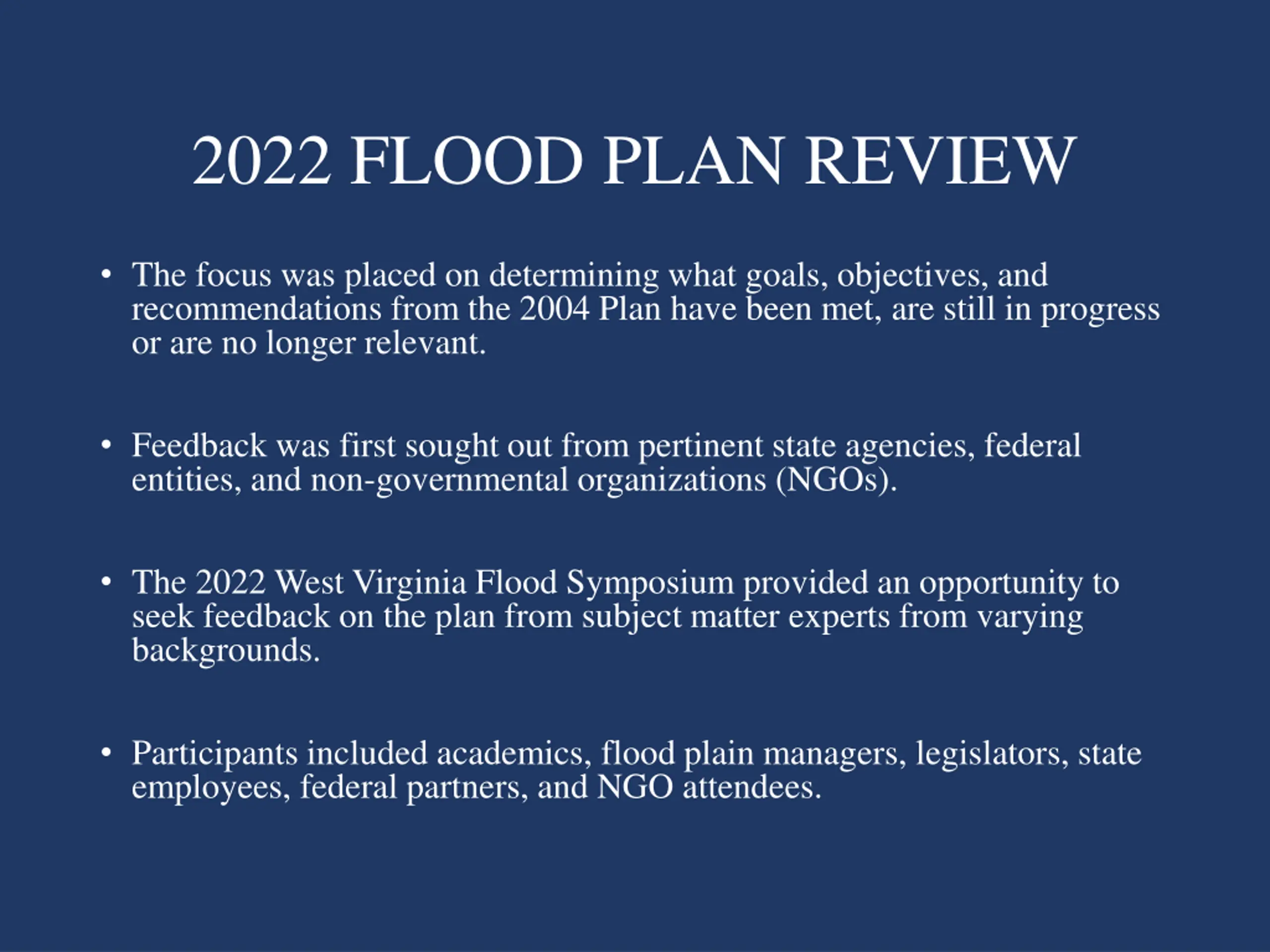 2022 FLOOD PLAN REVIEW The focus was placed on determining what goals, objectives, and recommendations from the 2004 Plan have been met, are still in progress or are no longer relevant. Feedback was first sought out from pertinent state agencies, federal entities, and non-governmental organizations (NGOs). The 2022 West Virginia Flood Symposium provided an opportunity to seek feedback on the plan from subject matter experts from varying backgrounds. Participants included academics, flood plain managers, legislators, state employees, federal partners, and NGO attendees.