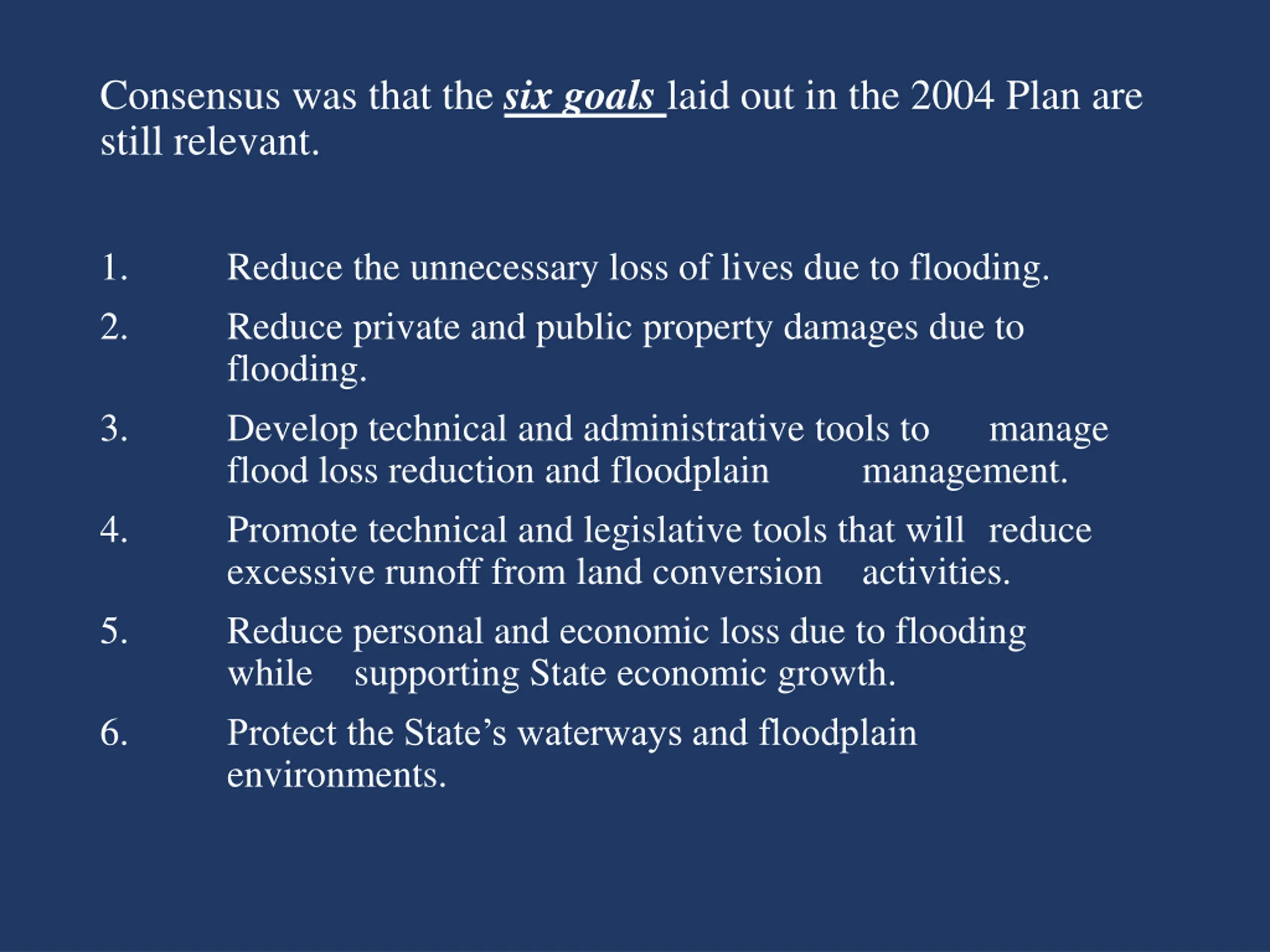 Consensus was that the six goals laid out in the 2004 Plan are still relevant. 1. 2. Reduce the unnecessary loss of lives due to flooding. Reduce private and public property damages due to flooding. Develop technical and administrative tools to flood loss reduction and floodplain Promote technical and legislative tools that will reduce excessive runoff from land conversion activities. Reduce personal and economic loss due to flooding while supporting State economic growth. Protect the State s waterways and floodplain environments. 3. manage management. 4. 5. 6.