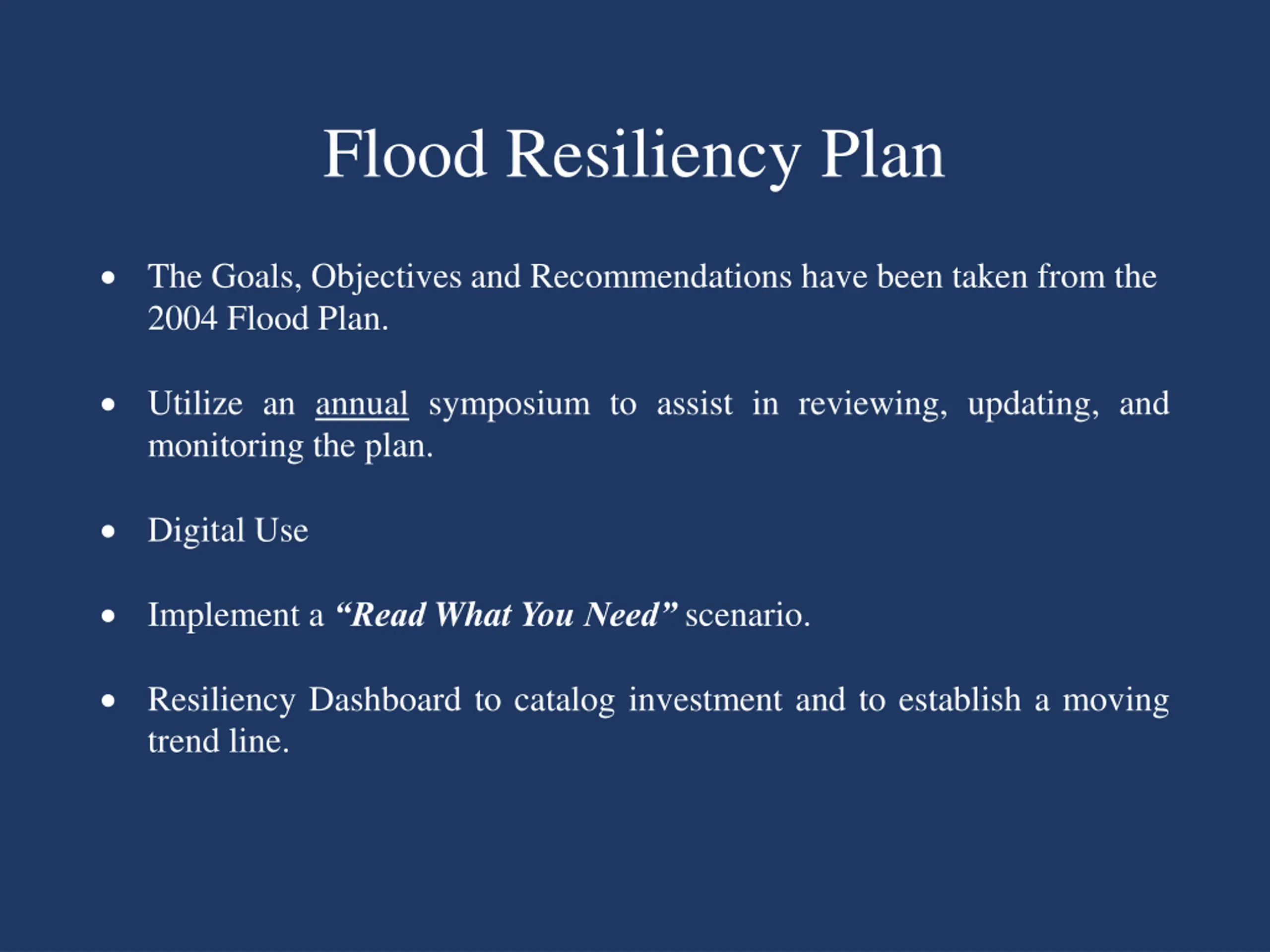 Flood Resiliency Plan The Goals, Objectives and Recommendations have been taken from the 2004 Flood Plan. Utilize an annual symposium to assist in reviewing, updating, and monitoring the plan. Digital Use Implement a Read What You Need scenario. Resiliency Dashboard to catalog investment and to establish a moving trend line.