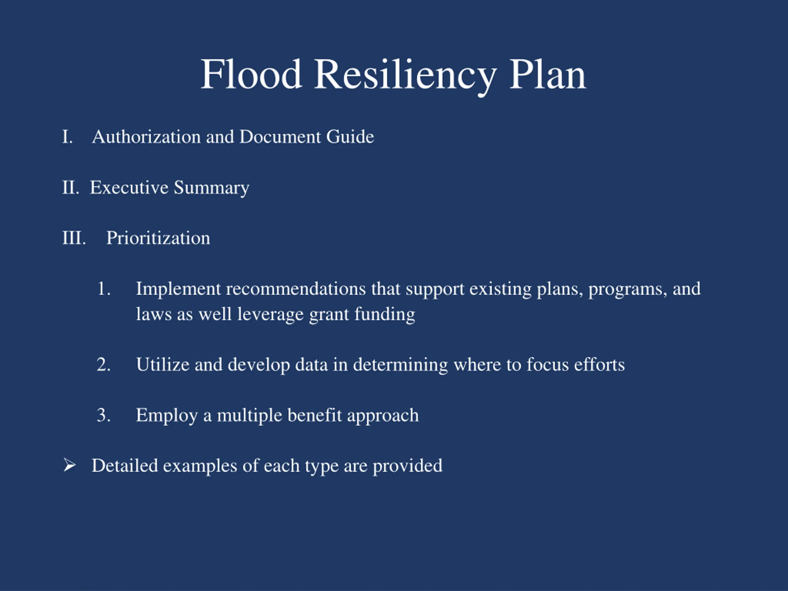 Flood Resiliency Plan I. Authorization and Document Guide II. Executive Summary III. Prioritization 1. Implement recommendations that support existing plans, programs, and laws as well leverage grant funding 2. Utilize and develop data in determining where to focus efforts 3. Employ a multiple benefit approach Detailed examples of each type are provided