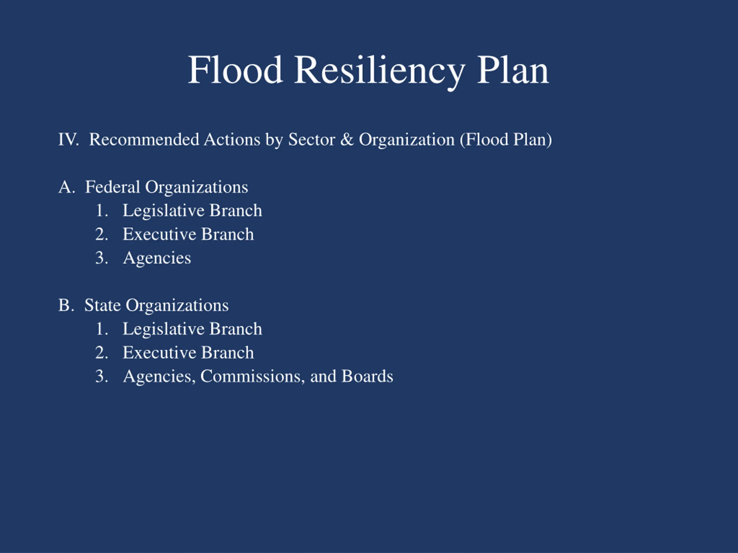 Flood Resiliency Plan IV. Recommended Actions by Sector & Organization (Flood Plan) A. Federal Organizations 1. Legislative Branch 2. Executive Branch 3. Agencies B. State Organizations 1. Legislative Branch 2. Executive Branch 3. Agencies, Commissions, and Boards