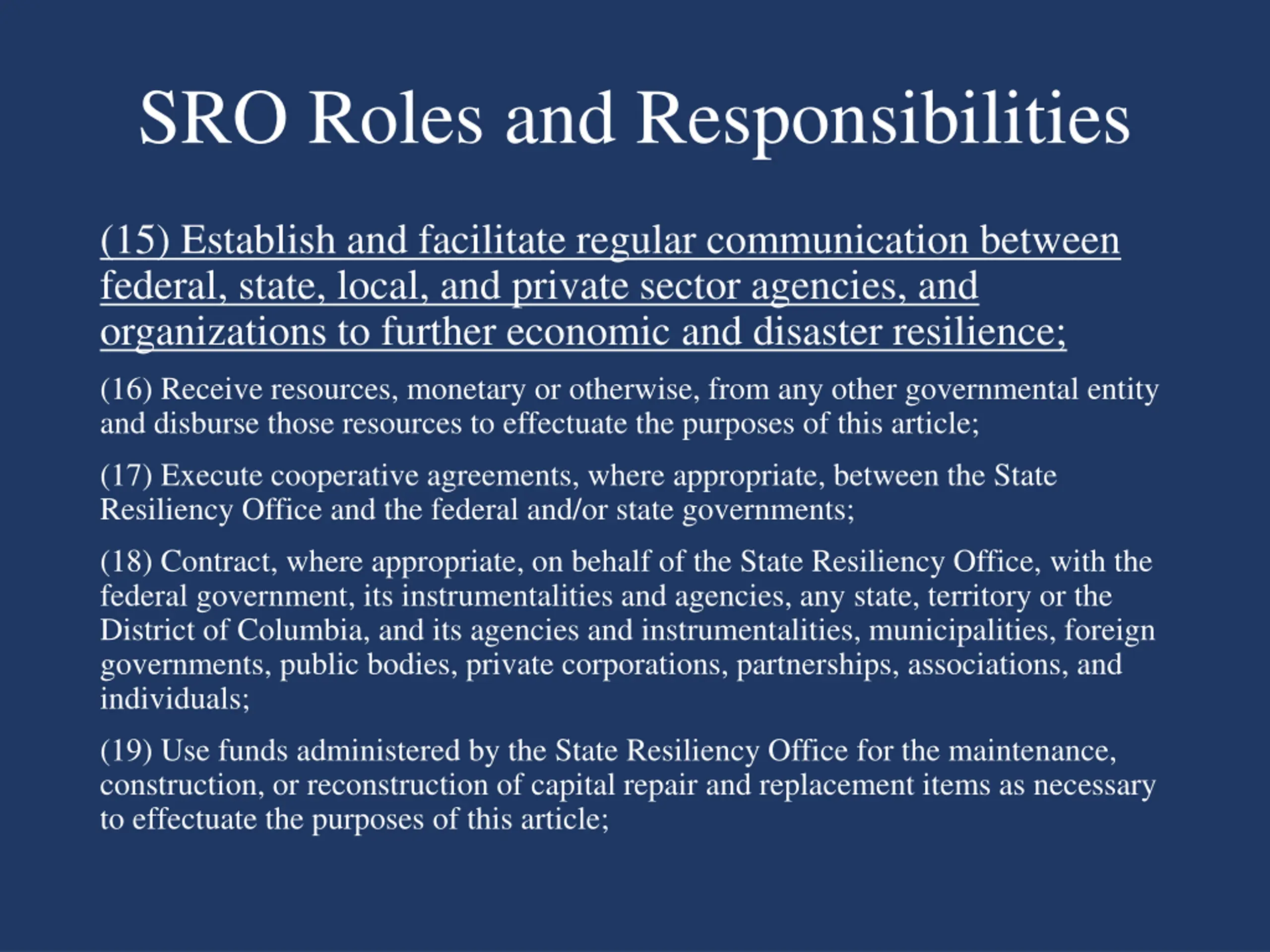 SRO Roles and Responsibilities (15) Establish and facilitate regular communication between federal, state, local, and private sector agencies, and organizations to further economic and disaster resilience; (16) Receive resources, monetary or otherwise, from any other governmental entity and disburse those resources to effectuate the purposes of this article; (17) Execute cooperative agreements, where appropriate, between the State Resiliency Office and the federal and/or state governments; (18) Contract, where appropriate, on behalf of the State Resiliency Office, with the federal government, its instrumentalities and agencies, any state, territory or the District of Columbia, and its agencies and instrumentalities, municipalities, foreign governments, public bodies, private corporations, partnerships, associations, and individuals; (19) Use funds administered by the State Resiliency Office for the maintenance, construction, or reconstruction of capital repair and replacement items as necessary to effectuate the purposes of this article;