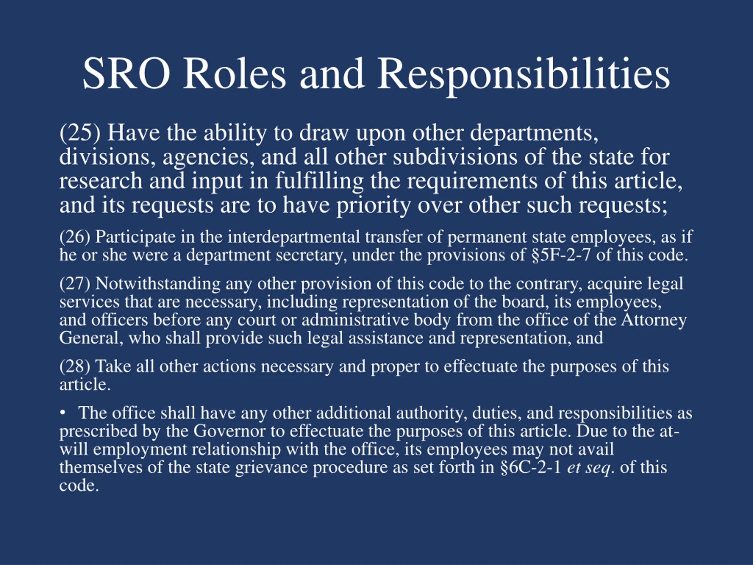 SRO Roles and Responsibilities (25) Have the ability to draw upon other departments, divisions, agencies, and all other subdivisions of the state for research and input in fulfilling the requirements of this article, and its requests are to have priority over other such requests; (26) Participate in the interdepartmental transfer of permanent state employees, as if he or she were a department secretary, under the provisions of 5F-2-7 of this code. (27) Notwithstanding any other provision of this code to the contrary, acquire legal services that are necessary, including representation of the board, its employees, and officers before any court or administrative body from the office of the Attorney General, who shall provide such legal assistance and representation, and (28) Take all other actions necessary and proper to effectuate the purposes of this article. The office shall have any other additional authority, duties, and responsibilities as prescribed by the Governor to effectuate the purposes of this article. Due to the at- will employment relationship with the office, its employees may not avail themselves of the state grievance procedure as set forth in 6C-2-1 et seq. of this code.