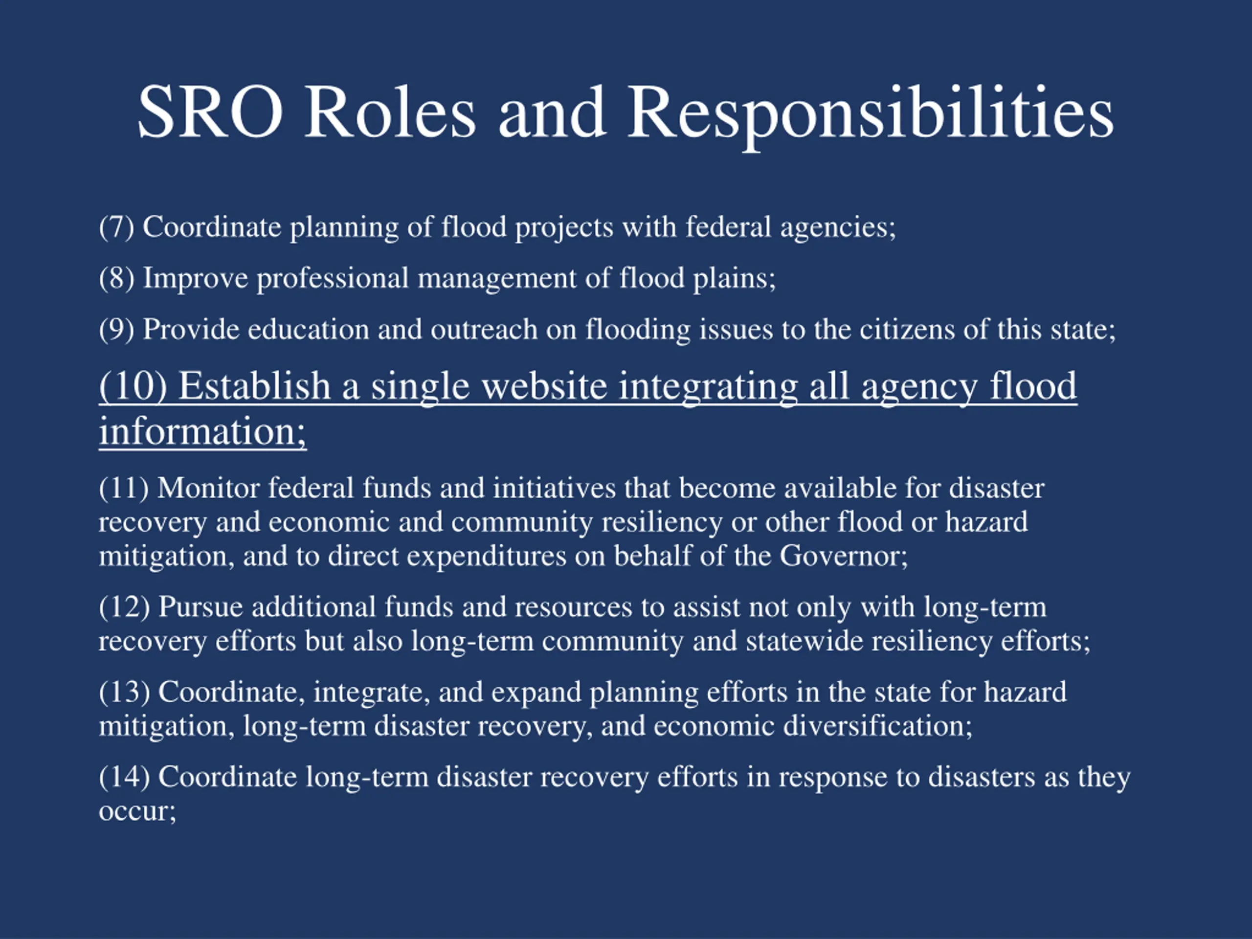 SRO Roles and Responsibilities (7) Coordinate planning of flood projects with federal agencies; (8) Improve professional management of flood plains; (9) Provide education and outreach on flooding issues to the citizens of this state; (10) Establish a single website integrating all agency flood information; (11) Monitor federal funds and initiatives that become available for disaster recovery and economic and community resiliency or other flood or hazard mitigation, and to direct expenditures on behalf of the Governor; (12) Pursue additional funds and resources to assist not only with long-term recovery efforts but also long-term community and statewide resiliency efforts; (13) Coordinate, integrate, and expand planning efforts in the state for hazard mitigation, long-term disaster recovery, and economic diversification; (14) Coordinate long-term disaster recovery efforts in response to disasters as they occur;