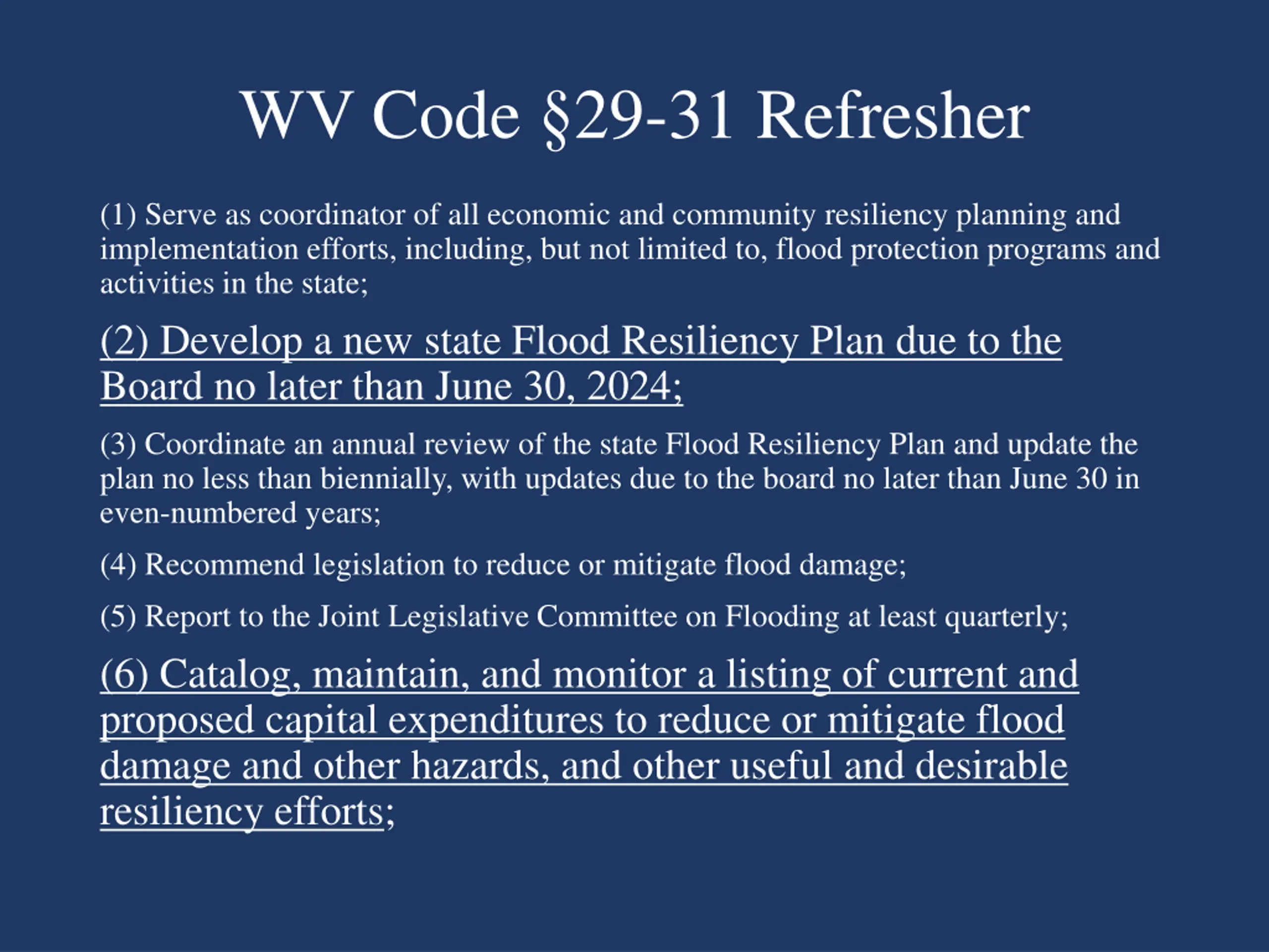WV Code 29-31 Refresher (1) Serve as coordinator of all economic and community resiliency planning and implementation efforts, including, but not limited to, flood protection programs and activities in the state; (2) Develop a new state Flood Resiliency Plan due to the Board no later than June 30, 2024; (3) Coordinate an annual review of the state Flood Resiliency Plan and update the plan no less than biennially, with updates due to the board no later than June 30 in even-numbered years; (4) Recommend legislation to reduce or mitigate flood damage; (5) Report to the Joint Legislative Committee on Flooding at least quarterly; (6) Catalog, maintain, and monitor a listing of current and proposed capital expenditures to reduce or mitigate flood damage and other hazards, and other useful and desirable resiliency efforts;