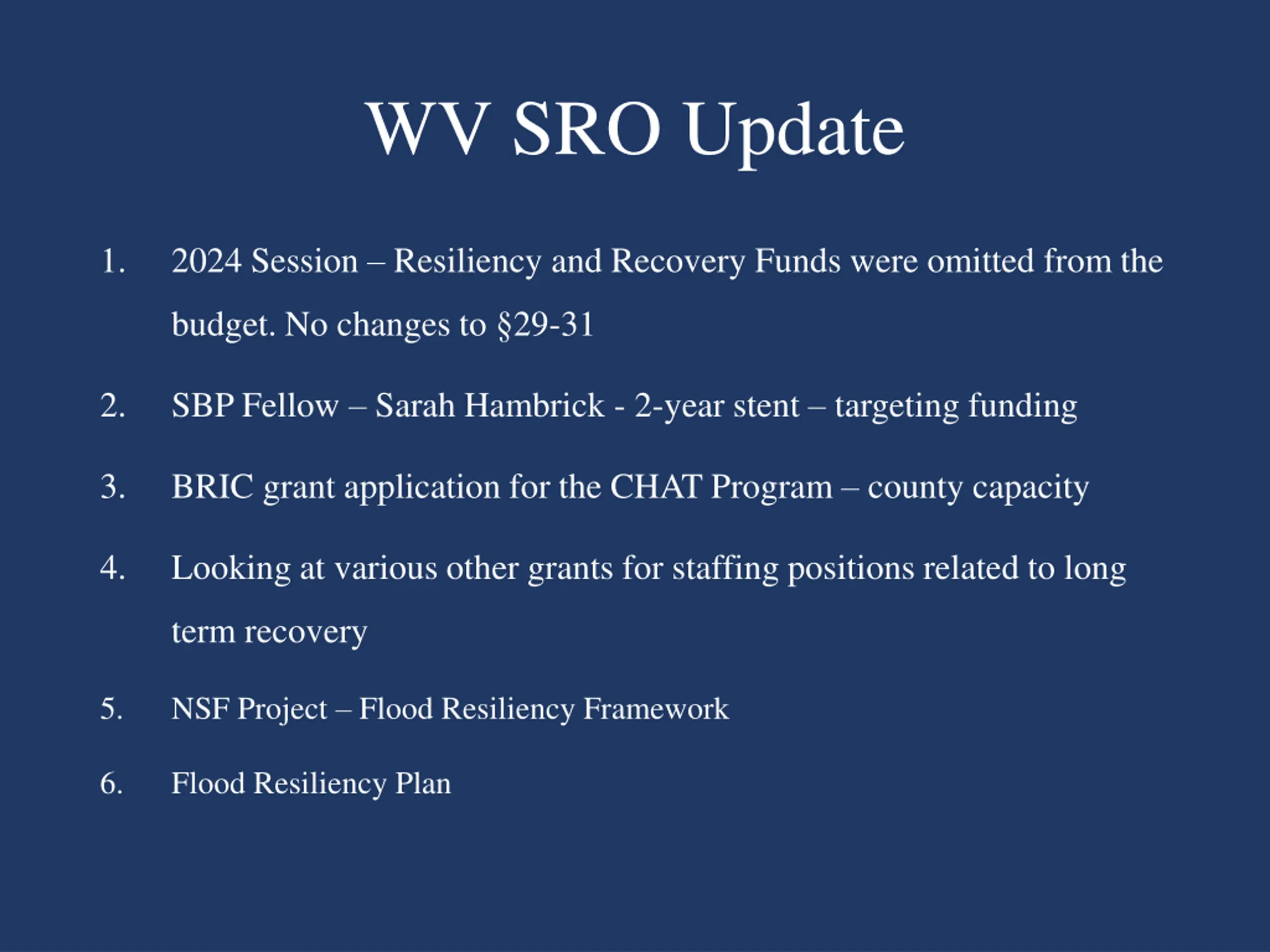 WV SRO Update 1. 2024 Session Resiliency and Recovery Funds were omitted from the budget. No changes to 29-31 2. SBP Fellow Sarah Hambrick - 2-year stent targeting funding 3. BRIC grant application for the CHAT Program county capacity 4. Looking at various other grants for staffing positions related to long term recovery 5. NSF Project Flood Resiliency Framework 6. Flood Resiliency Plan