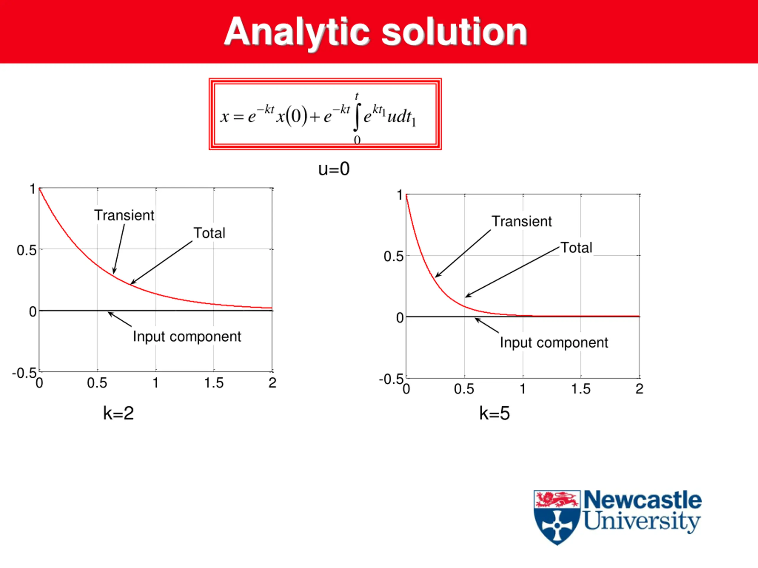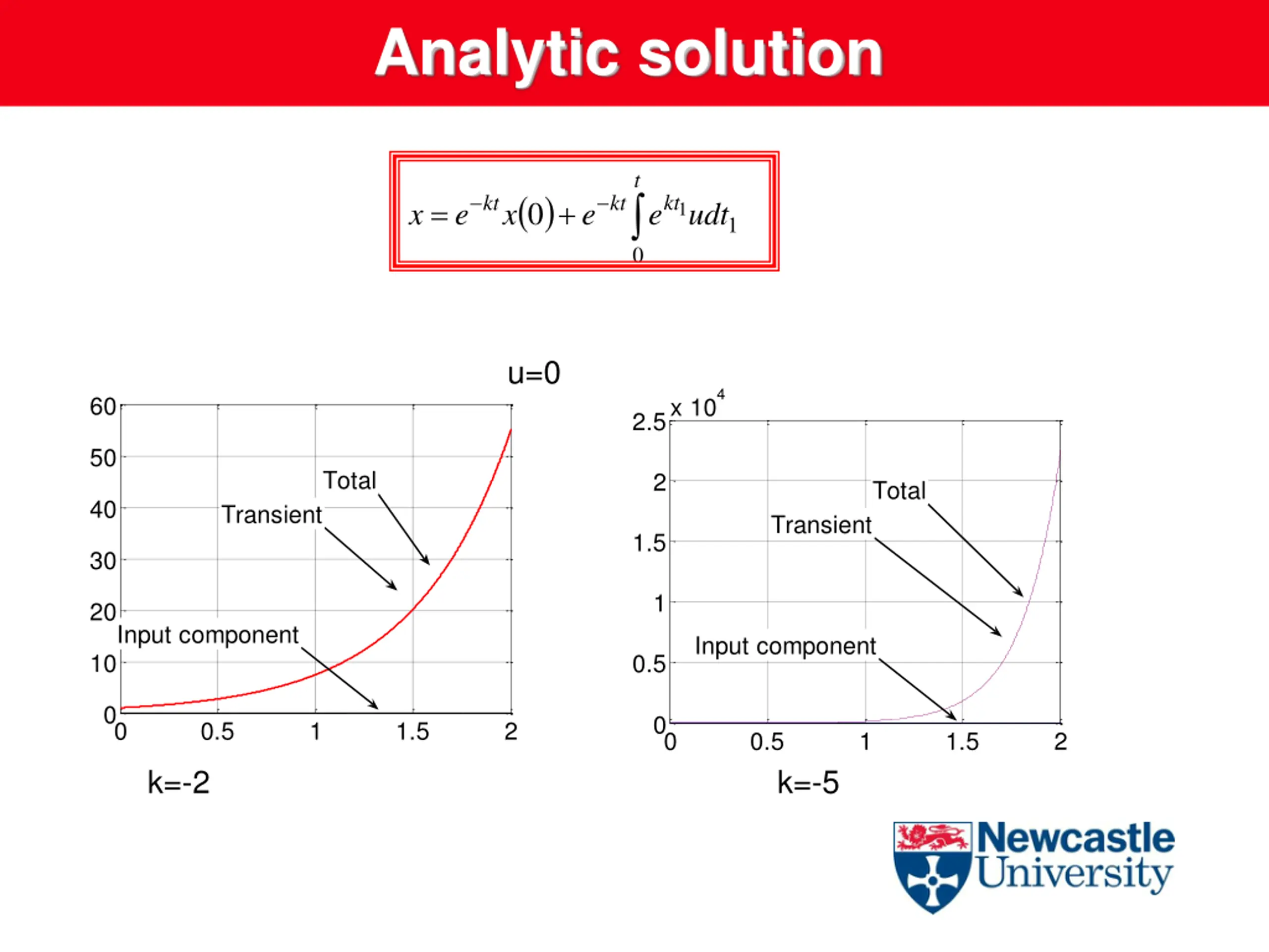 Analytic solution t ( ) 0 0 kt kt kt = + x e x e e udt 1 1 u=0 4 60 2.5x 10 50 Total 2 Total 40 Transient Transient 1.5 30 1 20 Input component Input component 10 0.5 0 0 0 0.5 1 1.5 2 0 0.5 1 1.5 2 k=-2 k=-5