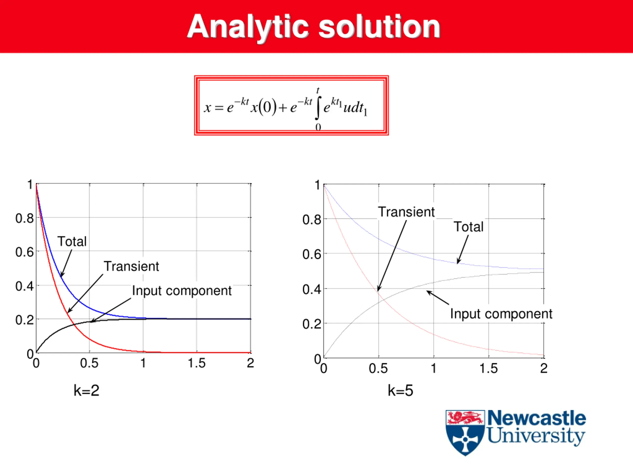 Analytic solution t ( ) 0 0 kt kt kt = + x e x e e udt 1 1 k=5, u=0 2 5 Total Total 1.5 4 Transient Transient 3 1 Input component Input component 2 0.5 1 0 0 0.5 1 1.5 2 0 0 0.5 1 1.5 2 x0=2 x0=5
