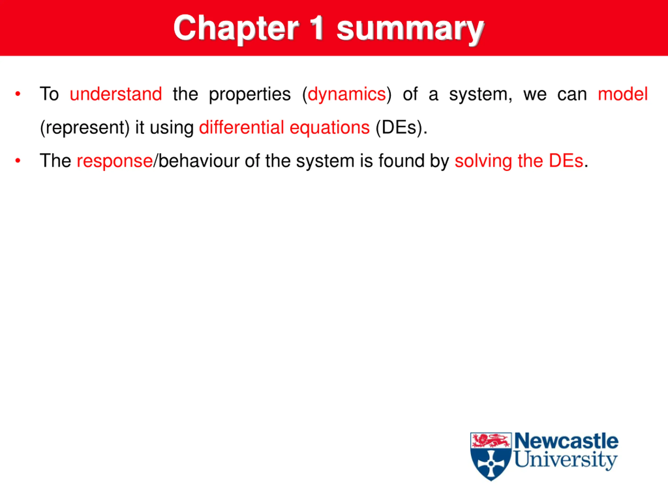 Chapter 1 summary To understand the properties (dynamics) of a system, we can model (represent) it using differential equations (DEs). The response/behaviour of the system is found by solving the DEs.