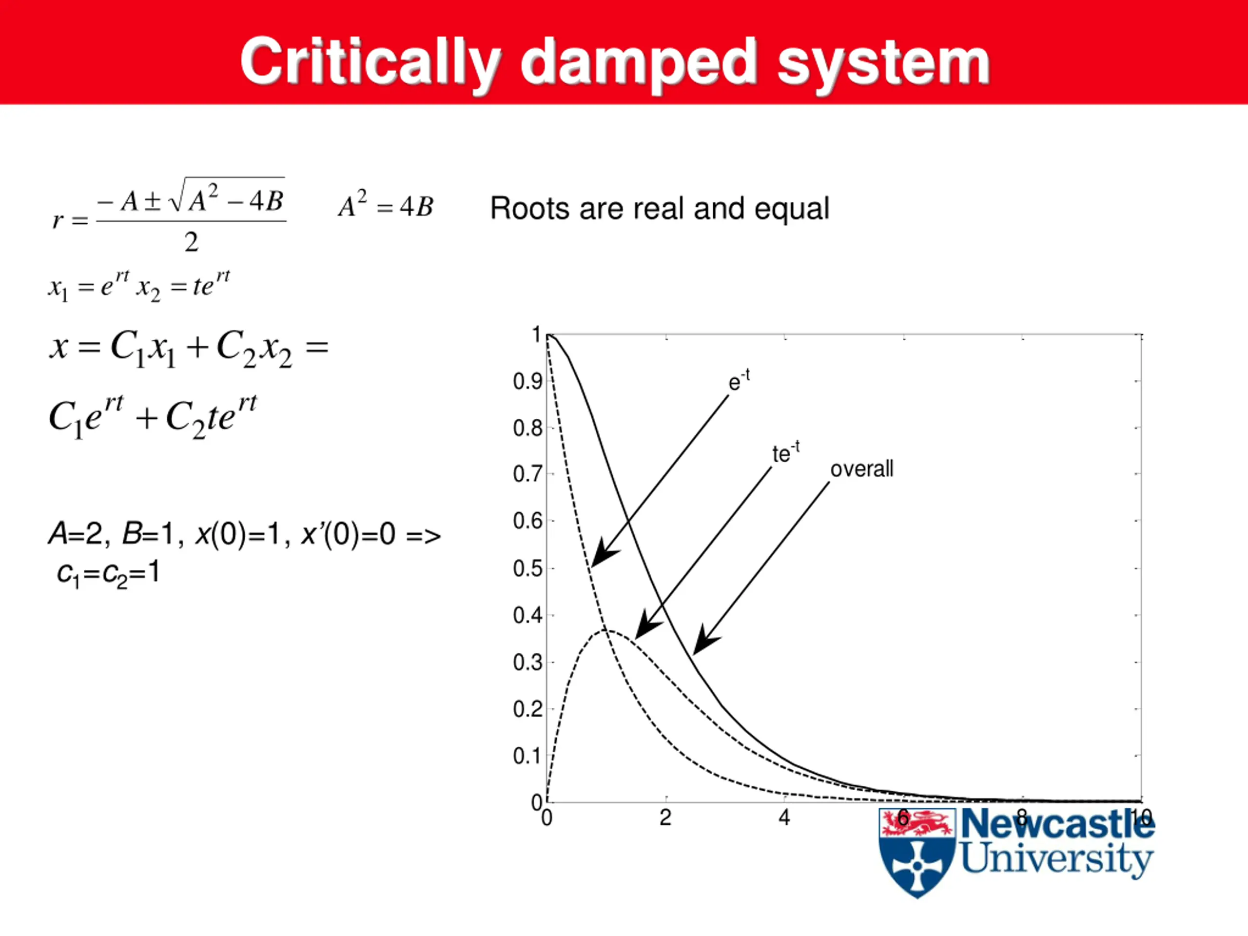 Critically damped system 2 4 A A B 2= Roots are real and equal 4 A B = r 2 rt rt x = 1 x x = 2 x 1 + e te + = = 1 C C x 1 2 2 e-t 0.9 rt rt C e C te 1 2 0.8 te-t overall 0.7 0.6 A=2, B=1, x(0)=1, x (0)=0 => c1=c2=1 0.5 0.4 0.3 0.2 0.1 0 0 2 4 6 8 10