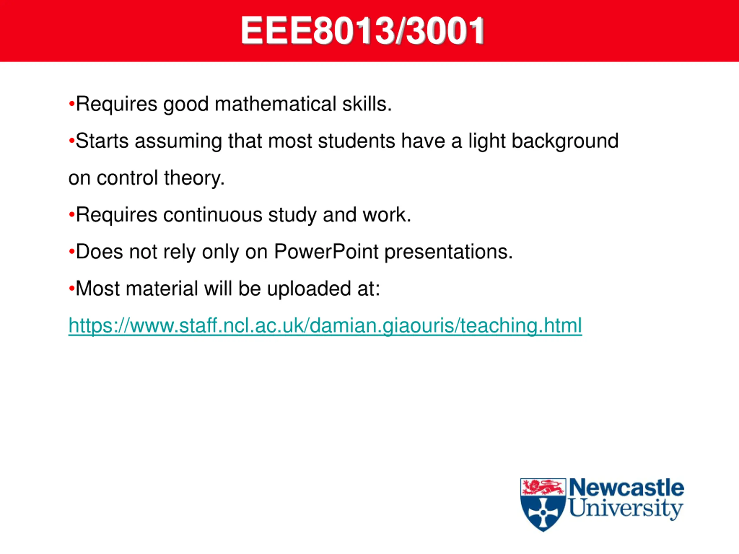 EEE8013/3001 Requires good mathematical skills. Starts assuming that most students have a light background on control theory. Requires continuous study and work. Does not rely only on PowerPoint presentations. Most material will be uploaded at: https://www.staff.ncl.ac.uk/damian.giaouris/teaching.html