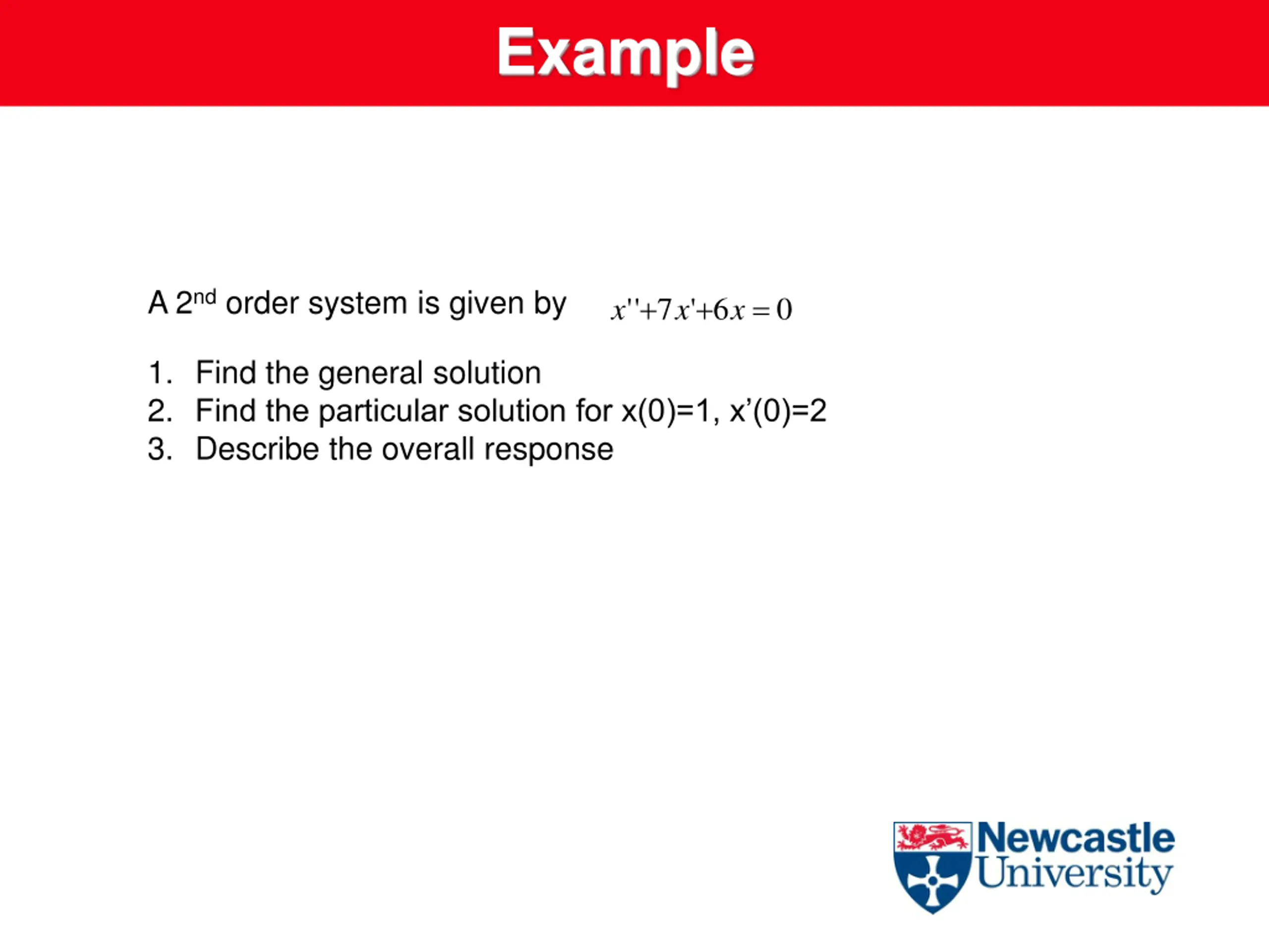 Example A 2nd order system is given by + + = ' ' x 7 ' 6 0 x x 1. Find the general solution 2. Find the particular solution for x(0)=1, x (0)=2 3. Describe the overall response