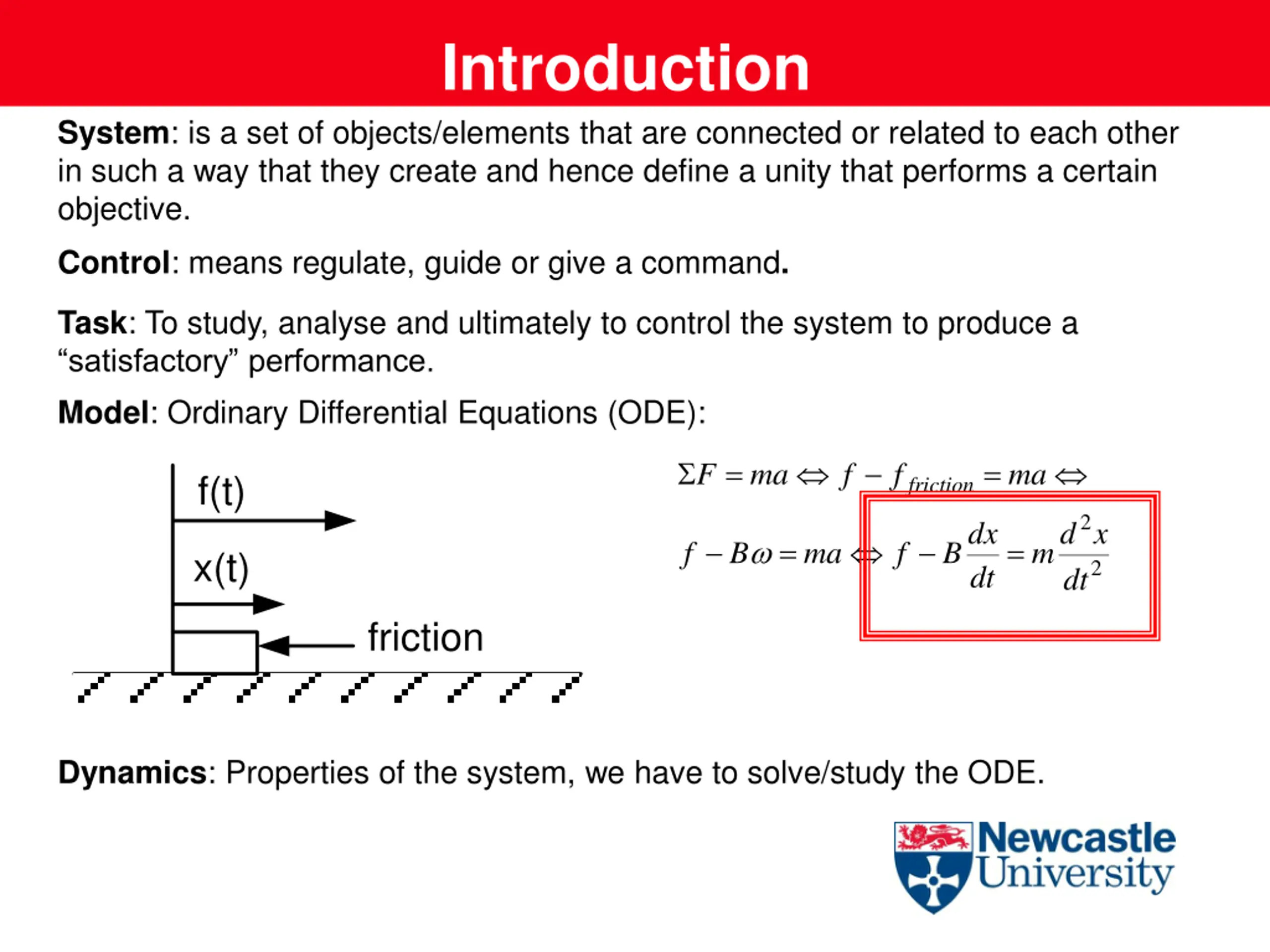 Introduction System: is a set of objects/elements that are connected or related to each other in such a way that they create and hence define a unity that performs a certain objective. Control: means regulate, guide or give a command. Task: To study, analyse and ultimately to control the system to produce a satisfactory performance. Model: Ordinary Differential Equations (ODE): = = F ma f f ma f(t) friction 2 dx d x = = f B ma f B m x(t) 2 dt dt friction Dynamics: Properties of the system, we have to solve/study the ODE.