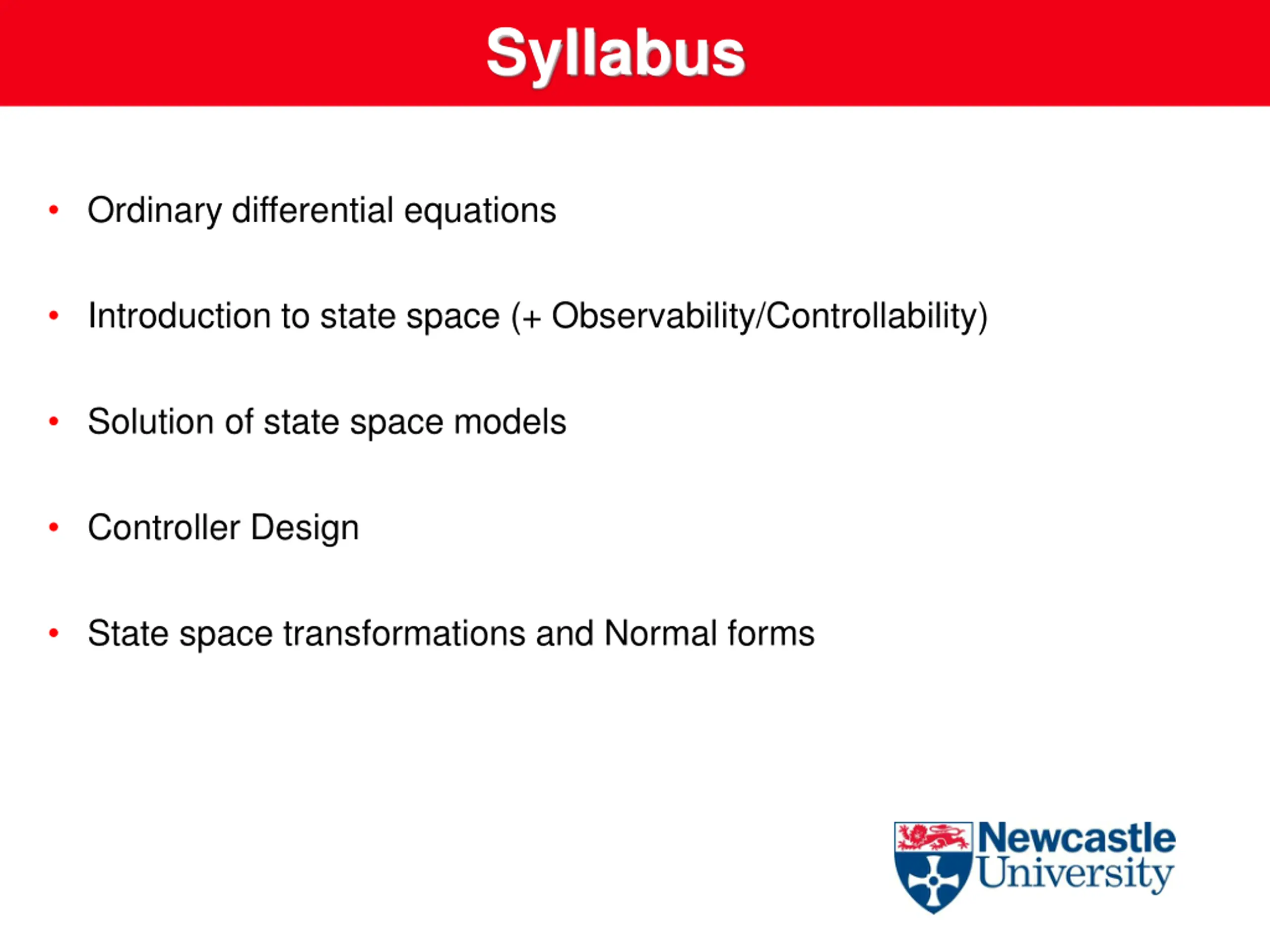 Syllabus Ordinary differential equations Introduction to state space (+ Observability/Controllability) Solution of state space models Controller Design State space transformations and Normal forms