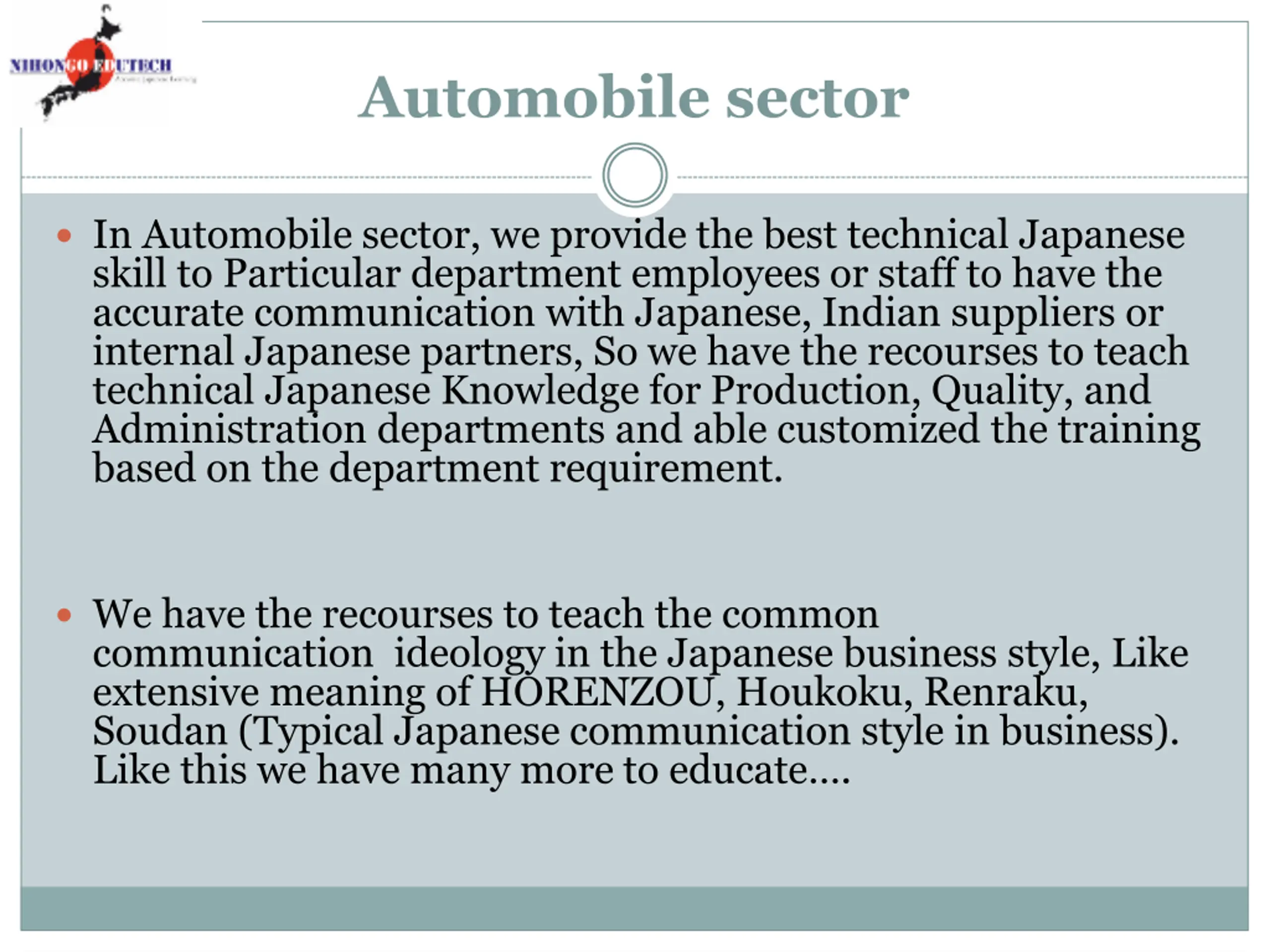 Automobile sector In Automobile sector, we provide the best technical Japanese skill to Particular department employees or staff to have the accurate communication with Japanese, Indian suppliers or internal Japanese partners, So we have the recourses to teach technical Japanese Knowledge for Production, Quality, and Administration departments and able customized the training based on the department requirement. We have the recourses to teach the common communication ideology in the Japanese business style, Like extensive meaning of HORENZOU, Houkoku, Renraku, Soudan (Typical Japanese communication style in business). Like this we have many more to educate .