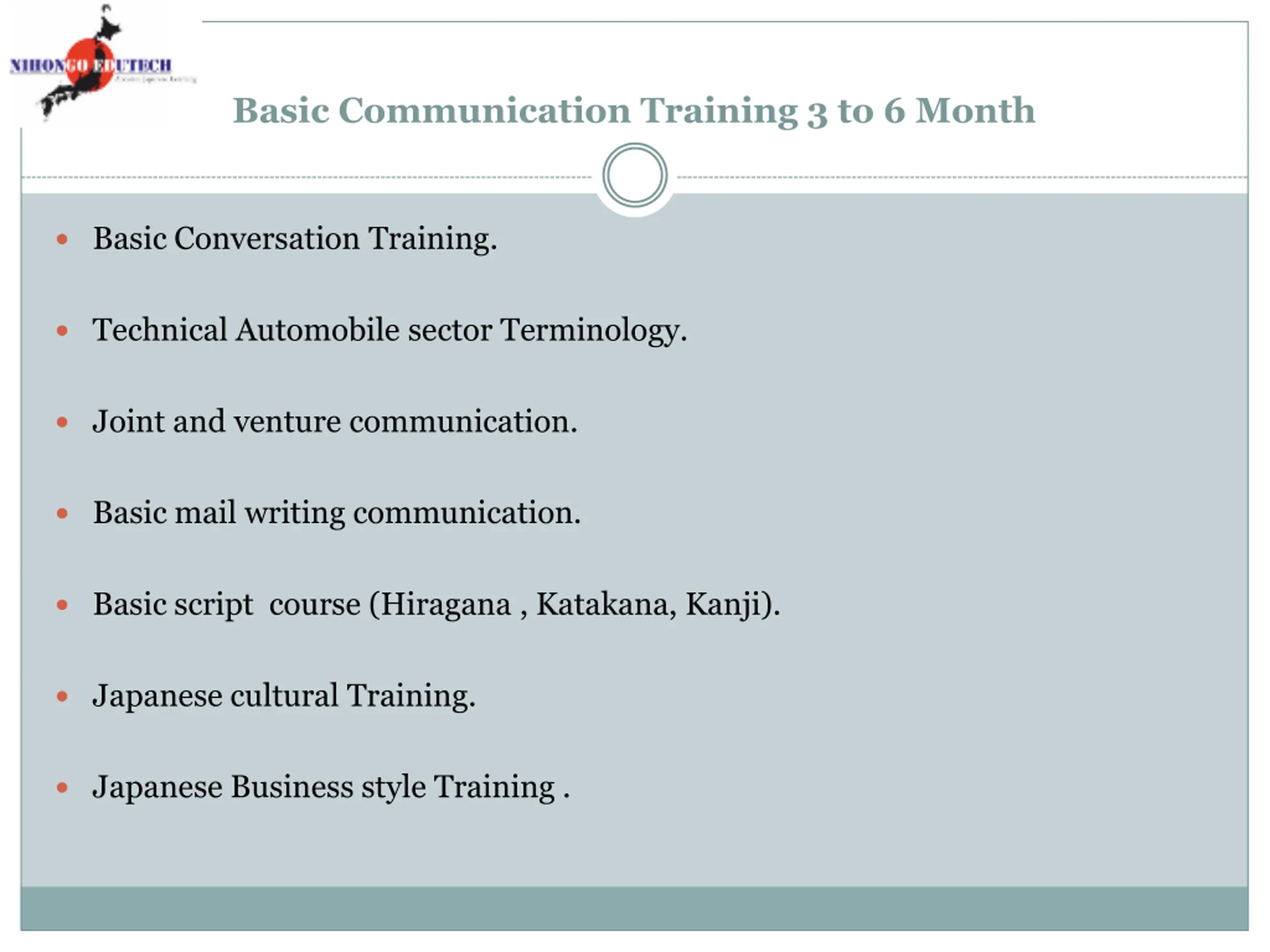 Basic Communication Training 3 to 6 Month Basic Conversation Training. Technical Automobile sector Terminology. Joint and venture communication. Basic mail writing communication. Basic script course (Hiragana , Katakana, Kanji). Japanese cultural Training. Japanese Business style Training .