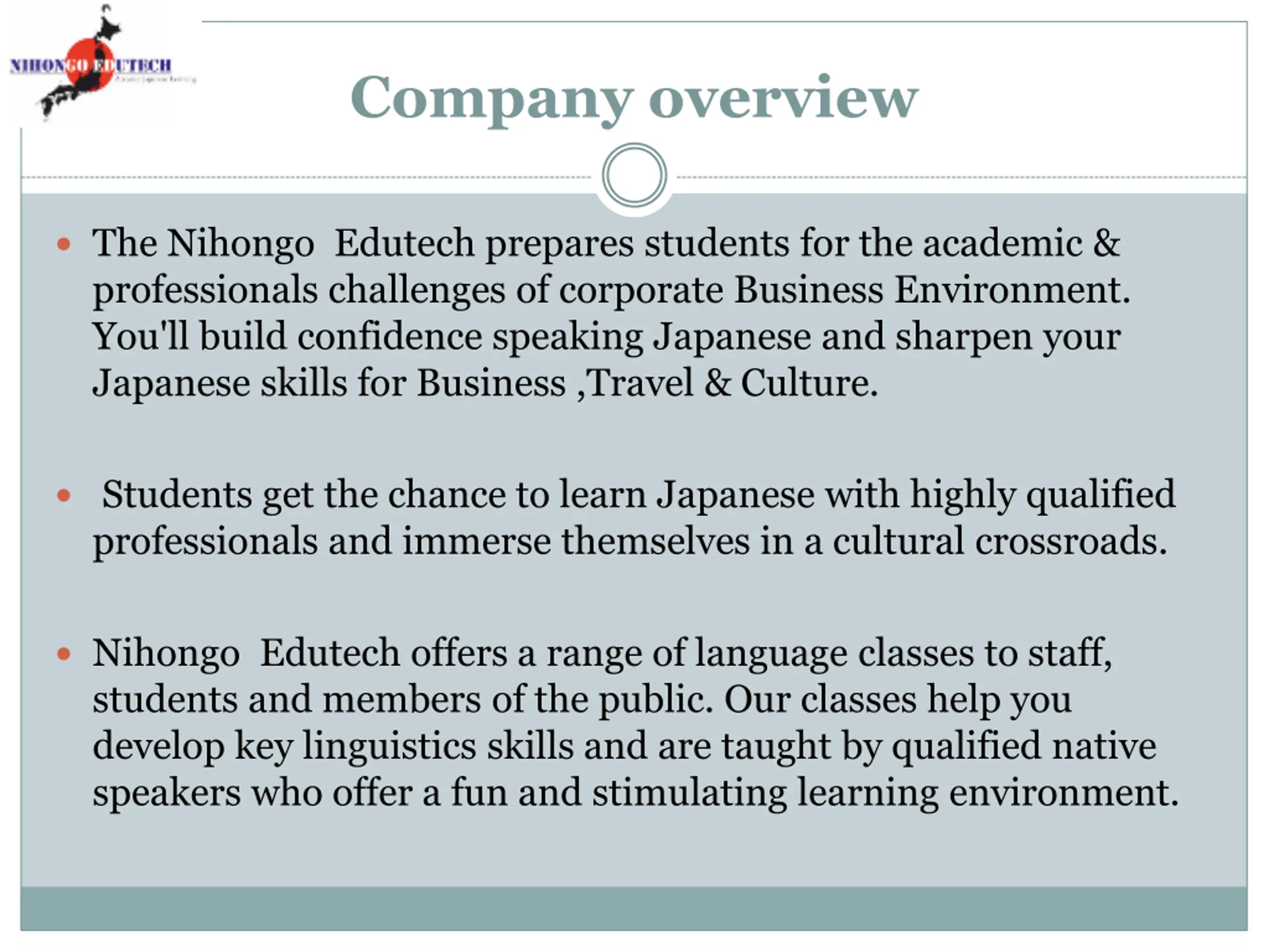 Company overview The Nihongo Edutech prepares students for the academic & professionals challenges of corporate Business Environment. You'll build confidence speaking Japanese and sharpen your Japanese skills for Business ,Travel & Culture. Students get the chance to learn Japanese with highly qualified professionals and immerse themselves in a cultural crossroads. Nihongo Edutech offers a range of language classes to staff, students and members of the public. Our classes help you develop key linguistics skills and are taught by qualified native speakers who offer a fun and stimulating learning environment.