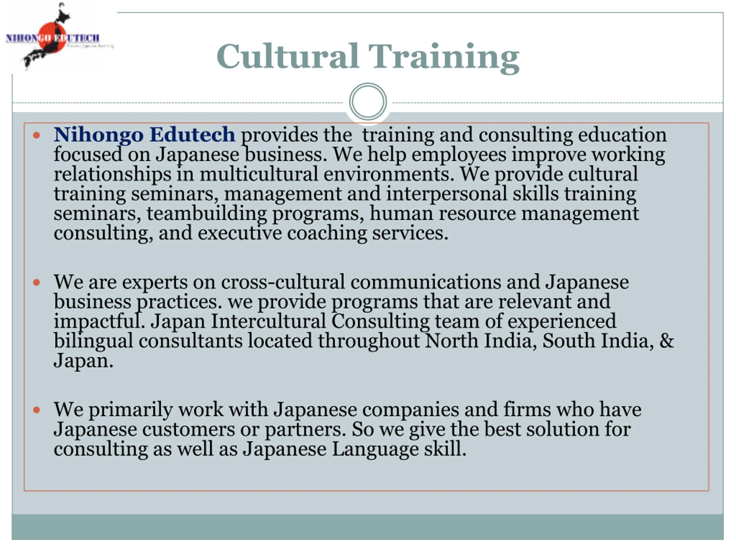 Cultural Training Nihongo Edutech provides the training and consulting education focused on Japanese business. We help employees improve working relationships in multicultural environments. We provide cultural training seminars, management and interpersonal skills training seminars, teambuilding programs, human resource management consulting, and executive coaching services. We are experts on cross-cultural communications and Japanese business practices. we provide programs that are relevant and impactful. Japan Intercultural Consulting team of experienced bilingual consultants located throughout North India, South India, & Japan. We primarily work with Japanese companies and firms who have Japanese customers or partners. So we give the best solution for consulting as well as Japanese Language skill.