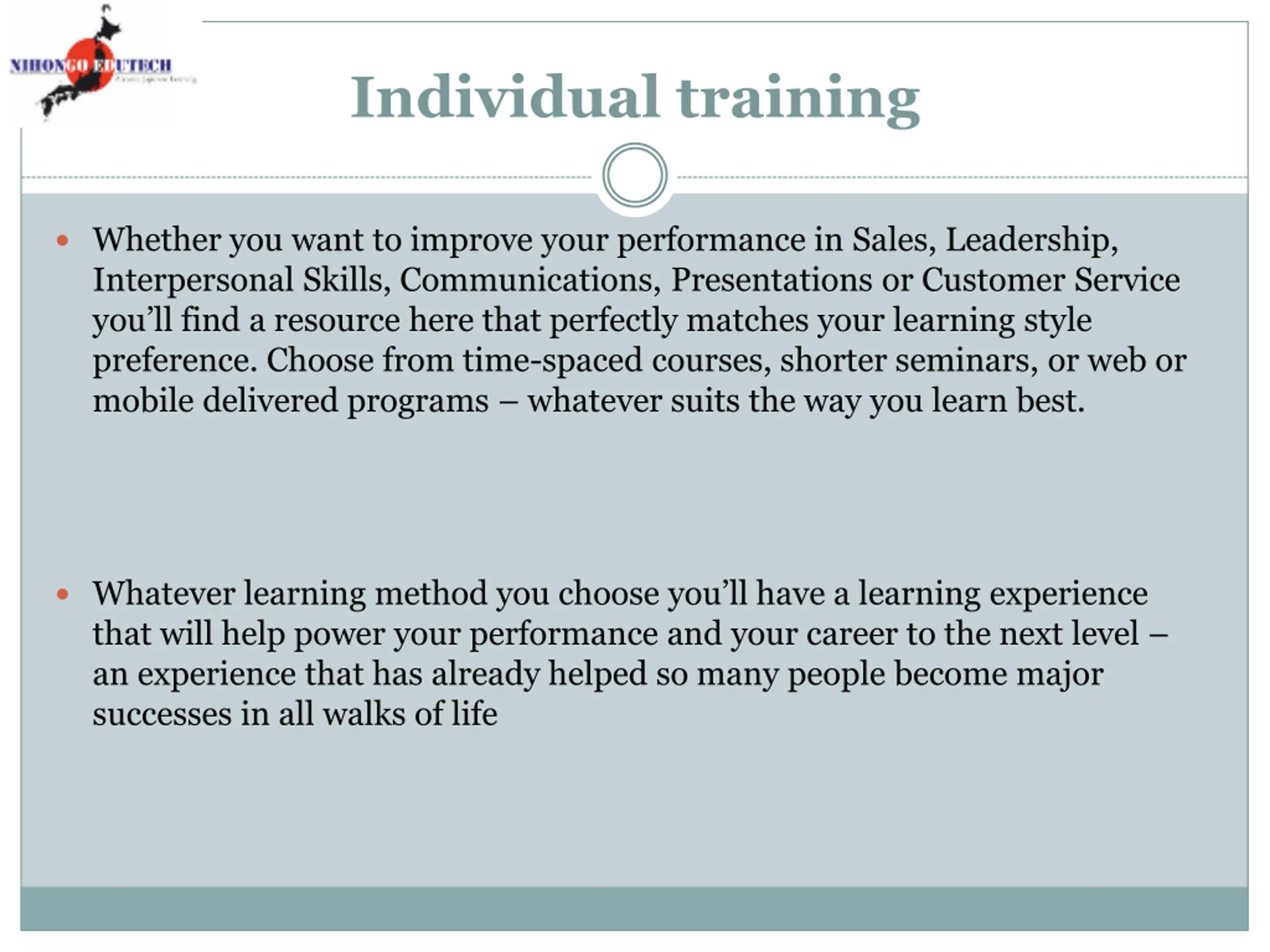 Individual training Whether you want to improve your performance in Sales, Leadership, Interpersonal Skills, Communications, Presentations or Customer Service you ll find a resource here that perfectly matches your learning style preference. Choose from time-spaced courses, shorter seminars, or web or mobile delivered programs whatever suits the way you learn best. Whatever learning method you choose you ll have a learning experience that will help power your performance and your career to the next level an experience that has already helped so many people become major successes in all walks of life