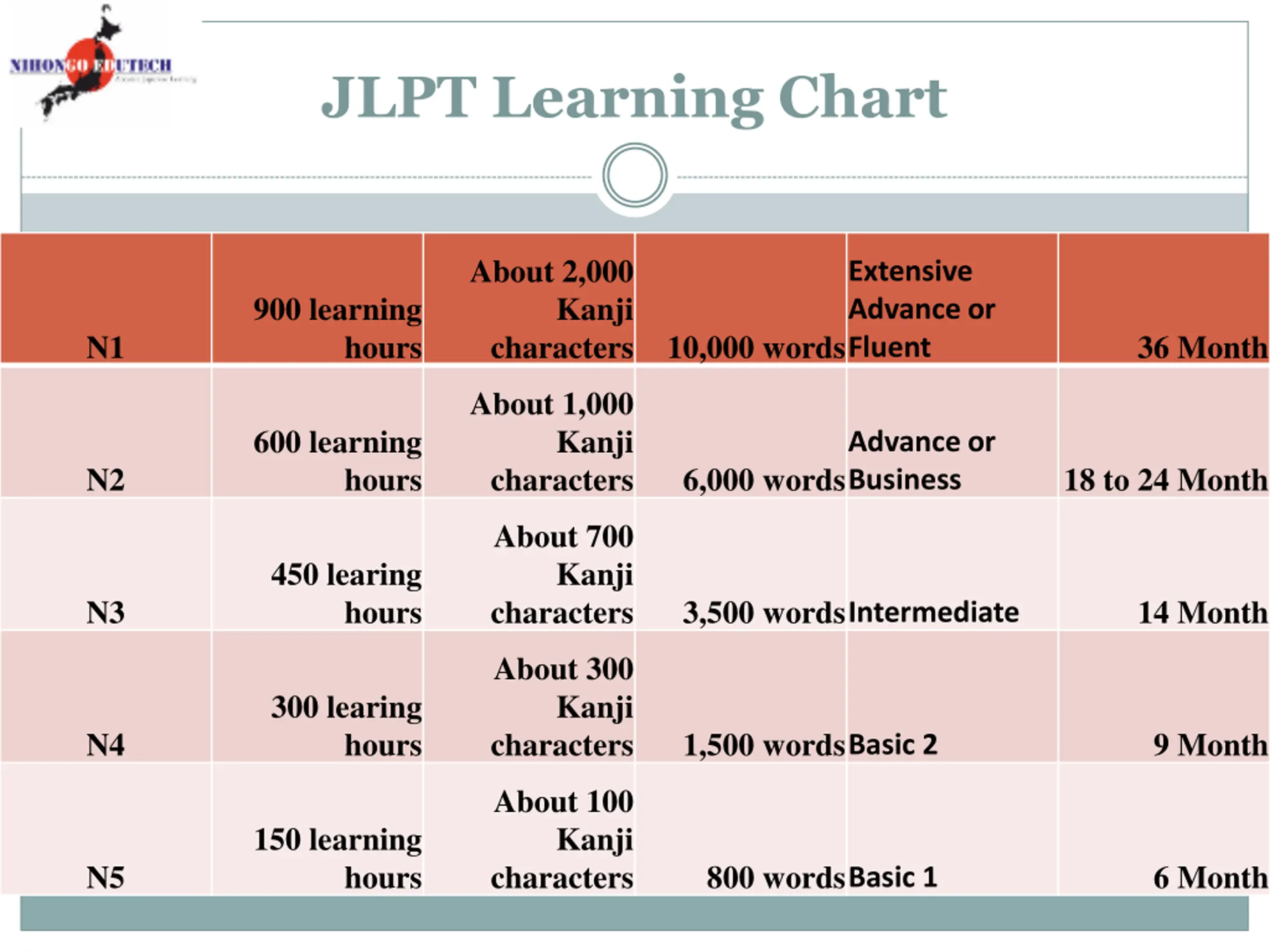 JLPT Learning Chart About 2,000 Extensive Advance or Fluent 900 learning Kanji N1 hours characters 10,000 words 36 Month About 1,000 600 learning Kanji Advance or Business N2 hours characters 6,000 words 18 to 24 Month About 700 Kanji characters 450 learing hours N3 3,500 wordsIntermediate 14 Month About 300 Kanji characters 300 learing hours N4 1,500 wordsBasic 2 9 Month About 100 Kanji characters 150 learning N5 hours 800 wordsBasic 1 6 Month