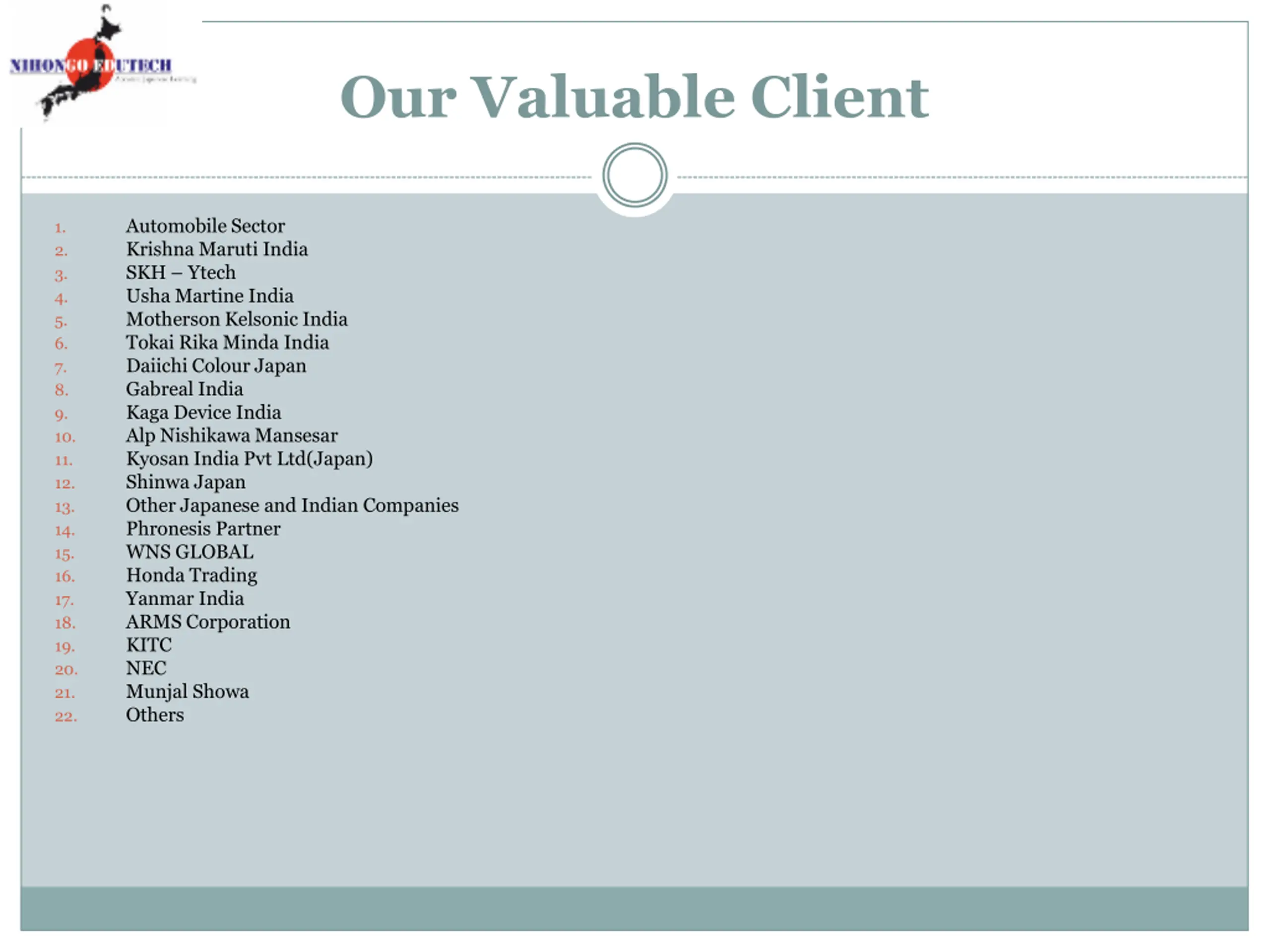 Our Valuable Client Automobile Sector Krishna Maruti India SKH Ytech Usha Martine India Motherson Kelsonic India Tokai Rika Minda India Daiichi Colour Japan Gabreal India Kaga Device India Alp Nishikawa Mansesar Kyosan India Pvt Ltd(Japan) Shinwa Japan Other Japanese and Indian Companies Phronesis Partner WNS GLOBAL Honda Trading Yanmar India ARMS Corporation KITC NEC Munjal Showa Others 1. 2. 3. 4. 5. 6. 7. 8. 9. 10. 11. 12. 13. 14. 15. 16. 17. 18. 19. 20. 21. 22.