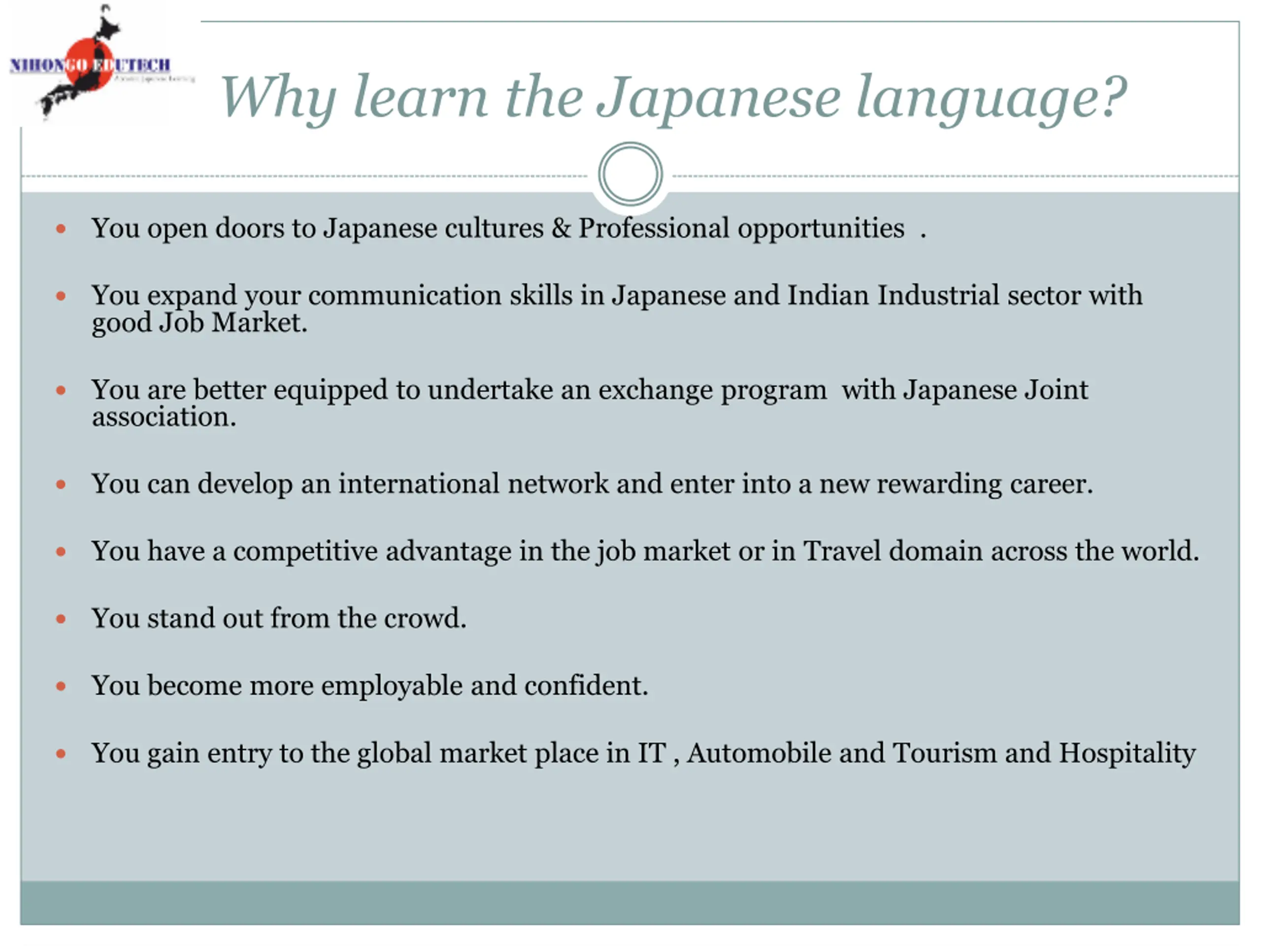 Why learn the Japanese language? You open doors to Japanese cultures & Professional opportunities . You expand your communication skills in Japanese and Indian Industrial sector with good Job Market. You are better equipped to undertake an exchange program with Japanese Joint association. You can develop an international network and enter into a new rewarding career. You have a competitive advantage in the job market or in Travel domain across the world. You stand out from the crowd. You become more employable and confident. You gain entry to the global market place in IT , Automobile and Tourism and Hospitality