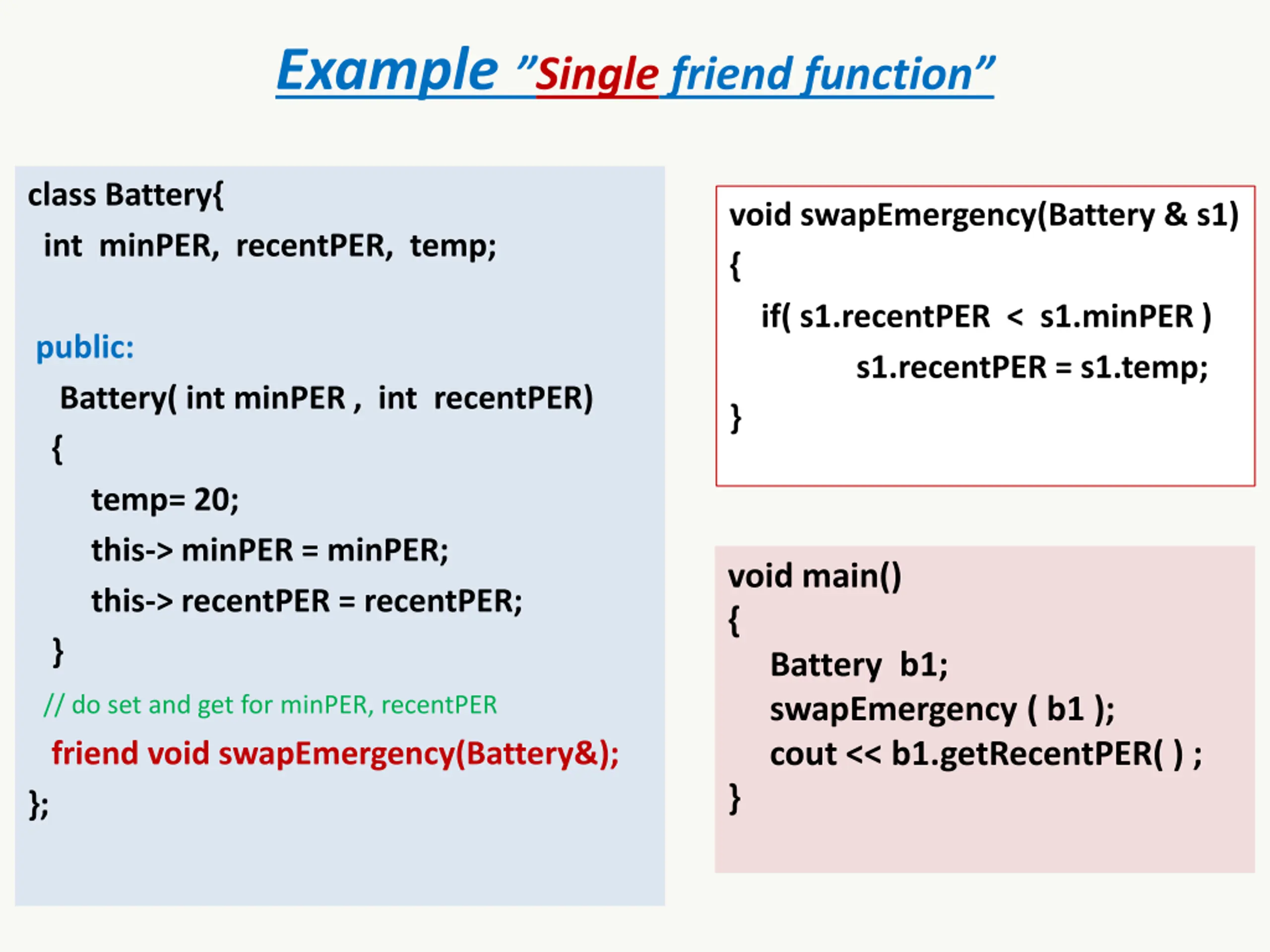 Example Single friend function class Battery{ int minPER, recentPER, temp; void swapEmergency(Battery & s1) { if( s1.recentPER < s1.minPER ) s1.recentPER = s1.temp; } public: Battery( int minPER , int recentPER) { temp= 20; this-> minPER = minPER; this-> recentPER = recentPER; } void main() { Battery b1; swapEmergency ( b1 ); cout << b1.getRecentPER( ) ; } // do set and get for minPER, recentPER friend void swapEmergency(Battery&); };