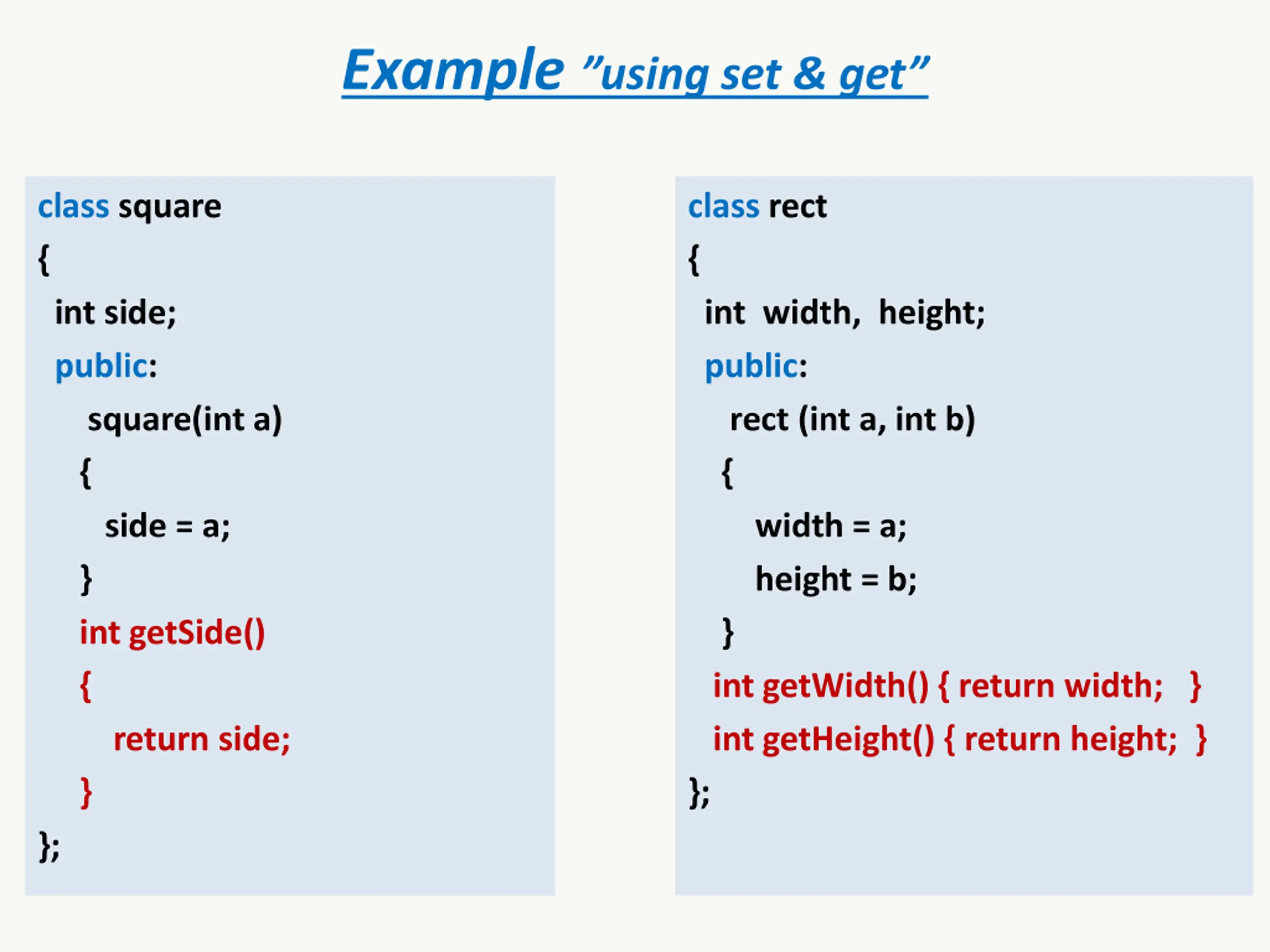 Example using set & get class square { int side; public: square(int a) { side = a; } int getSide() { return side; } }; class rect { int width, height; public: rect (int a, int b) { width = a; height = b; } int getWidth() { return width; } int getHeight() { return height; } };