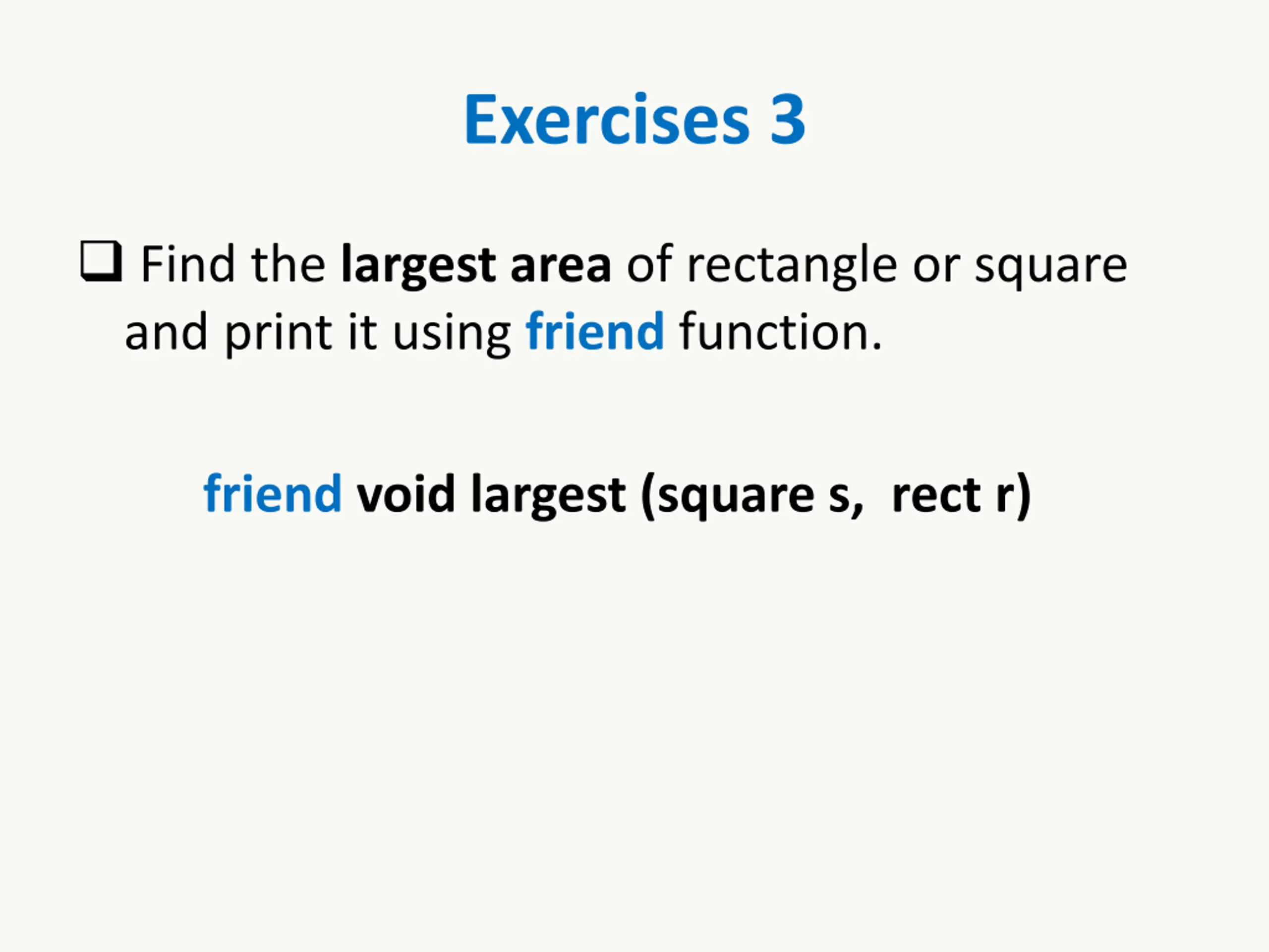 Exercises 3 Find the largest area of rectangle or square and print it using friend function. friend void largest (square s, rect r)