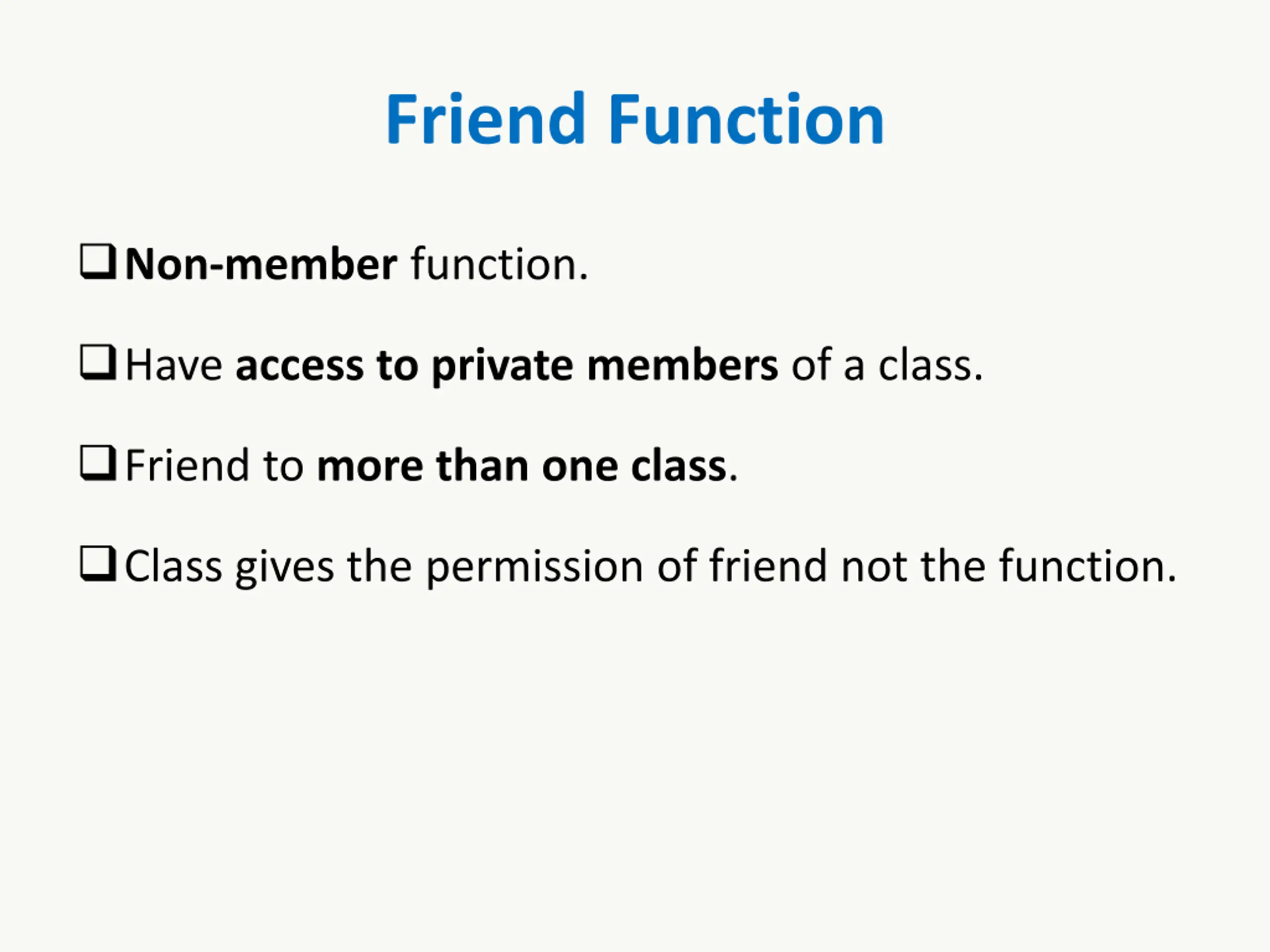 Friend Function Non-member function. Have access to private members of a class. Friend to more than one class. Class gives the permission of friend not the function.