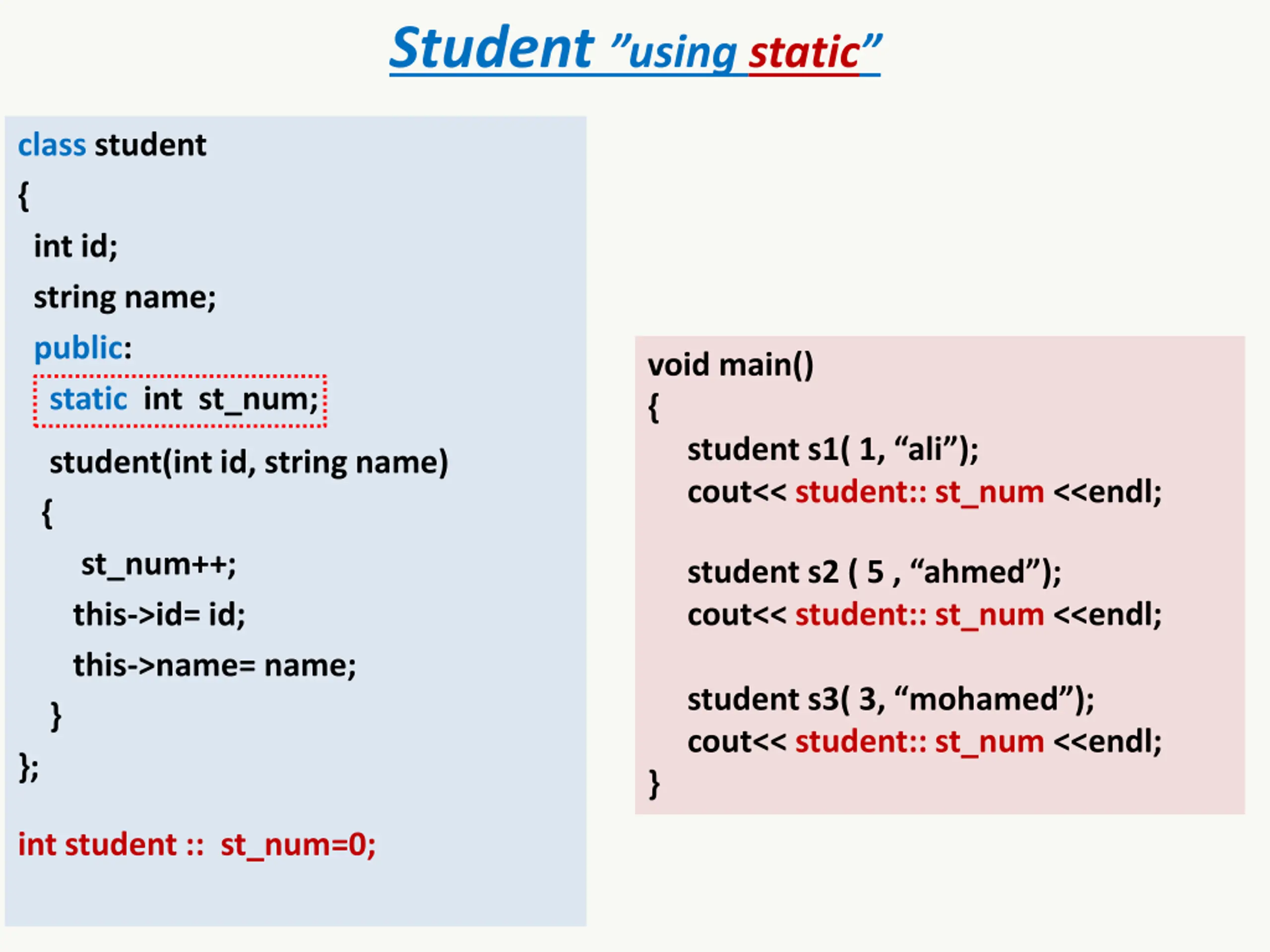 Student using static class student { int id; string name; public: static int st_num; void main() { student s1( 1, ali ); cout<< student:: st_num <<endl; student(int id, string name) { st_num++; this->id= id; this->name= name; } }; student s2 ( 5 , ahmed ); cout<< student:: st_num <<endl; student s3( 3, mohamed ); cout<< student:: st_num <<endl; } int student :: st_num=0;