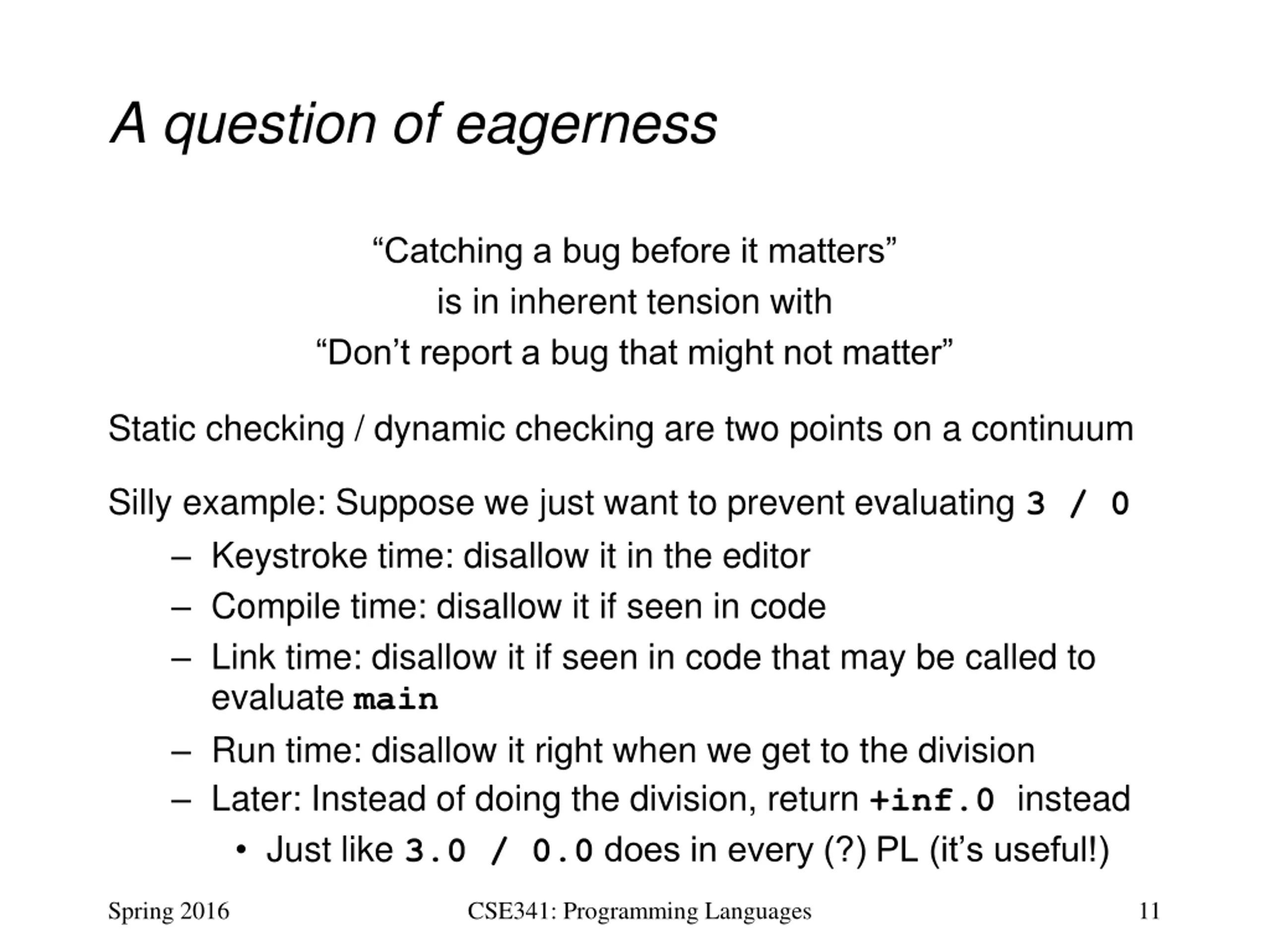 A question of eagerness Catching a bug before it matters is in inherent tension with Don t report a bug that might not matter Static checking / dynamic checking are two points on a continuum Silly example: Suppose we just want to prevent evaluating 3 / 0 Keystroke time: disallow it in the editor Compile time: disallow it if seen in code Link time: disallow it if seen in code that may be called to evaluate main Run time: disallow it right when we get to the division Later: Instead of doing the division, return +inf.0 instead Just like 3.0 / 0.0does in every (?) PL (it s useful!) Spring 2016 CSE341: Programming Languages 11