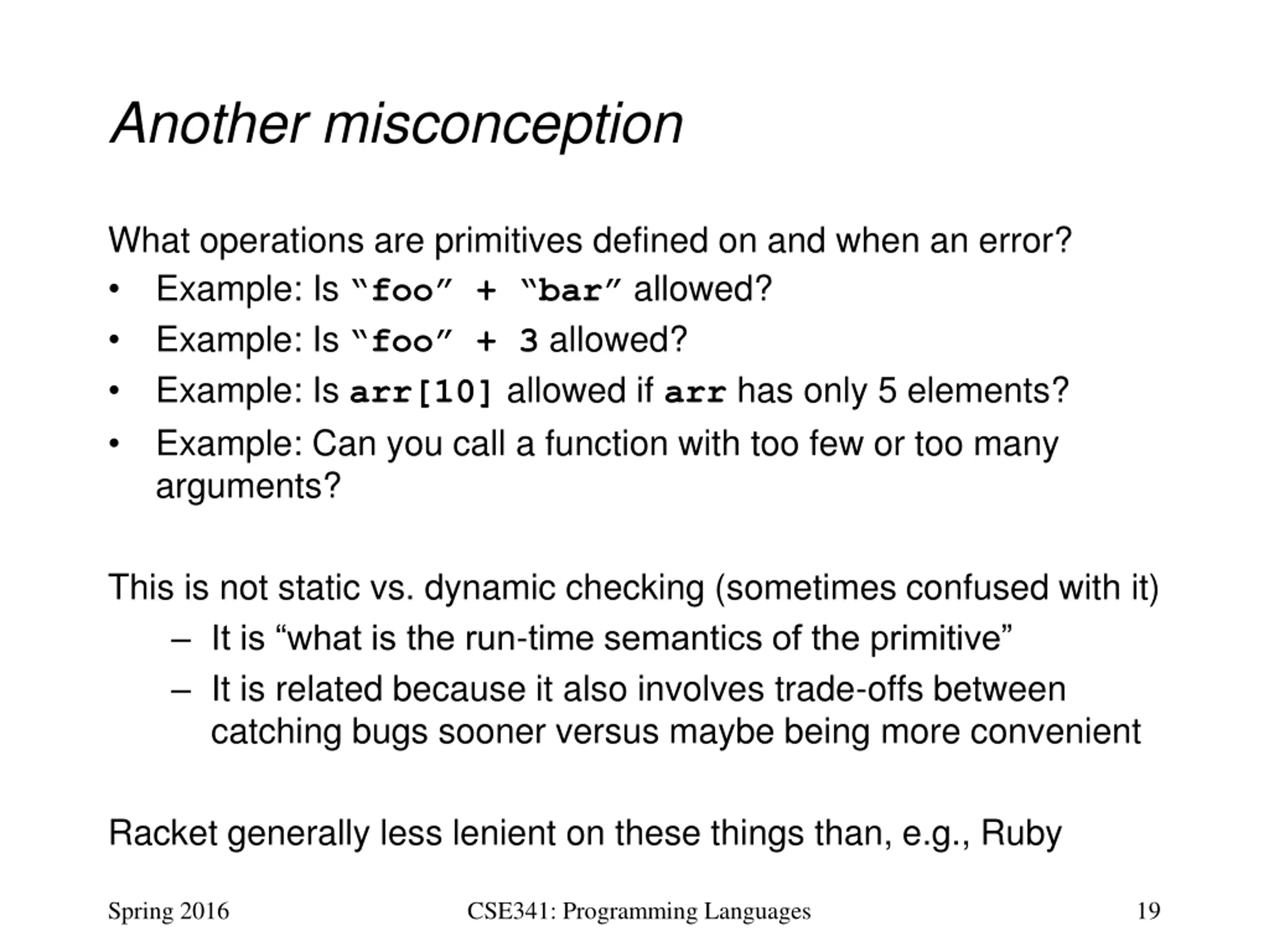 Another misconception What operations are primitives defined on and when an error? Example: Is foo + bar allowed? Example: Is foo + 3 allowed? Example: Is arr[10] allowed if arr has only 5 elements? Example: Can you call a function with too few or too many arguments? This is not static vs. dynamic checking (sometimes confused with it) It is what is the run-time semantics of the primitive It is related because it also involves trade-offs between catching bugs sooner versus maybe being more convenient Racket generally less lenient on these things than, e.g., Ruby Spring 2016 CSE341: Programming Languages 19