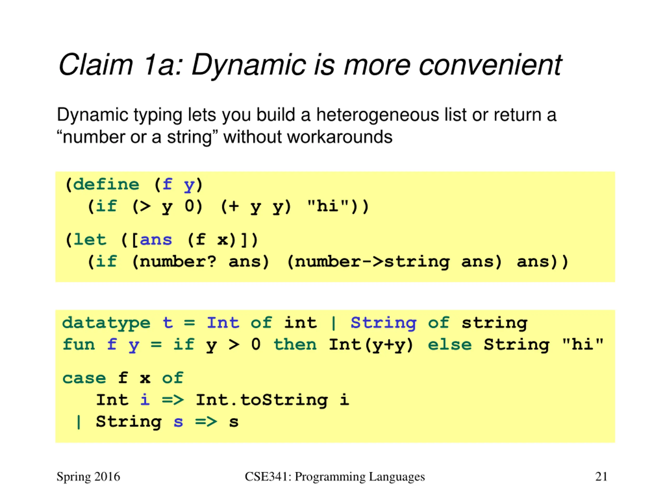 Claim 1a: Dynamic is more convenient Dynamic typing lets you build a heterogeneous list or return a number or a string without workarounds (define (f y) (if (> y 0) (+ y y) "hi")) (let ([ans (f x)]) (if (number? ans) (number->string ans) ans)) datatype t = Int of int | String of string fun f y = if y > 0 then Int(y+y) else String "hi" case f x of Int i => Int.toString i | String s => s Spring 2016 CSE341: Programming Languages 21