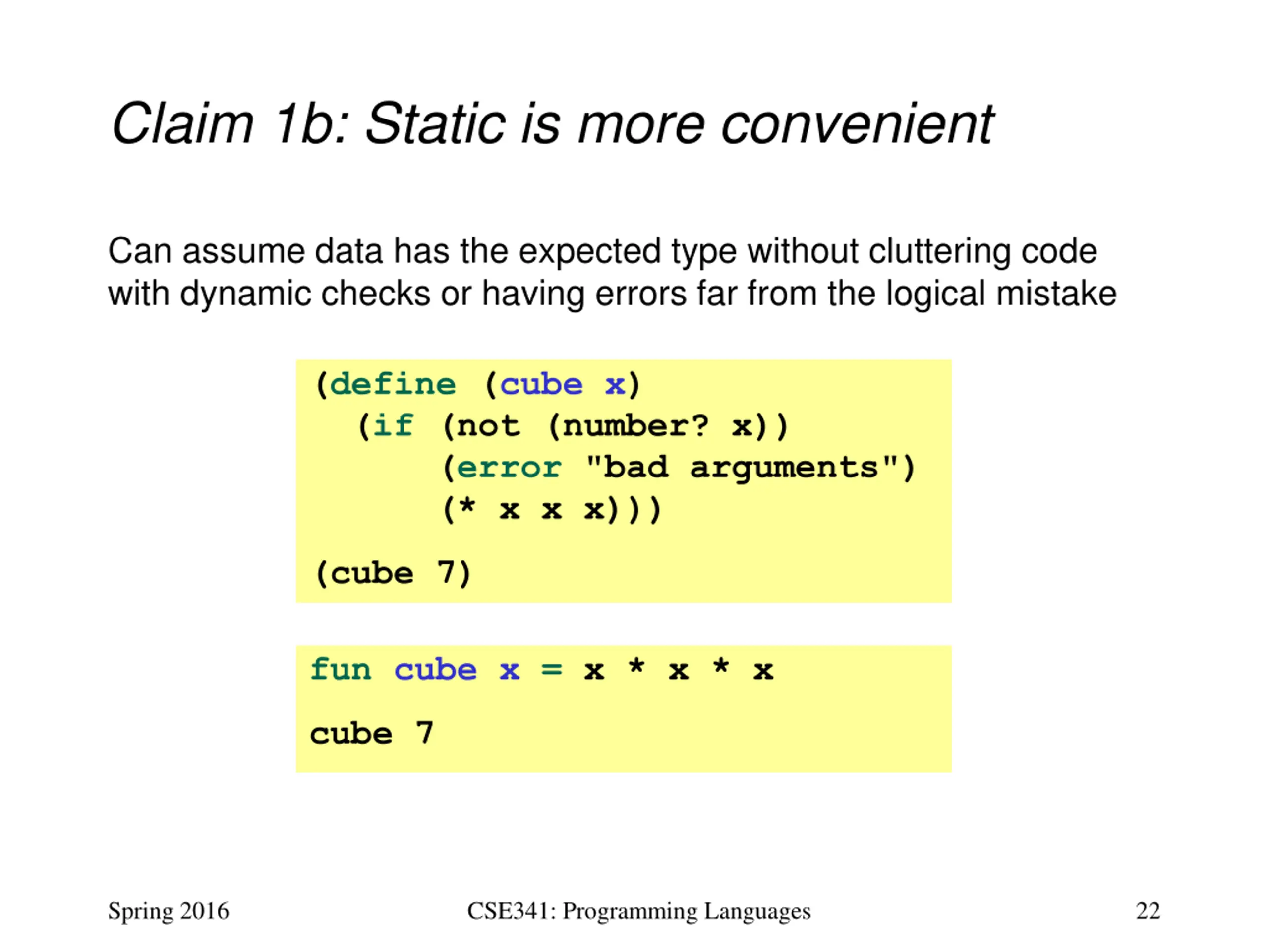 Claim 1b: Static is more convenient Can assume data has the expected type without cluttering code with dynamic checks or having errors far from the logical mistake (define (cube x) (if (not (number? x)) (error "bad arguments") (* x x x))) (cube 7) fun cube x = x * x * x cube 7 Spring 2016 CSE341: Programming Languages 22
