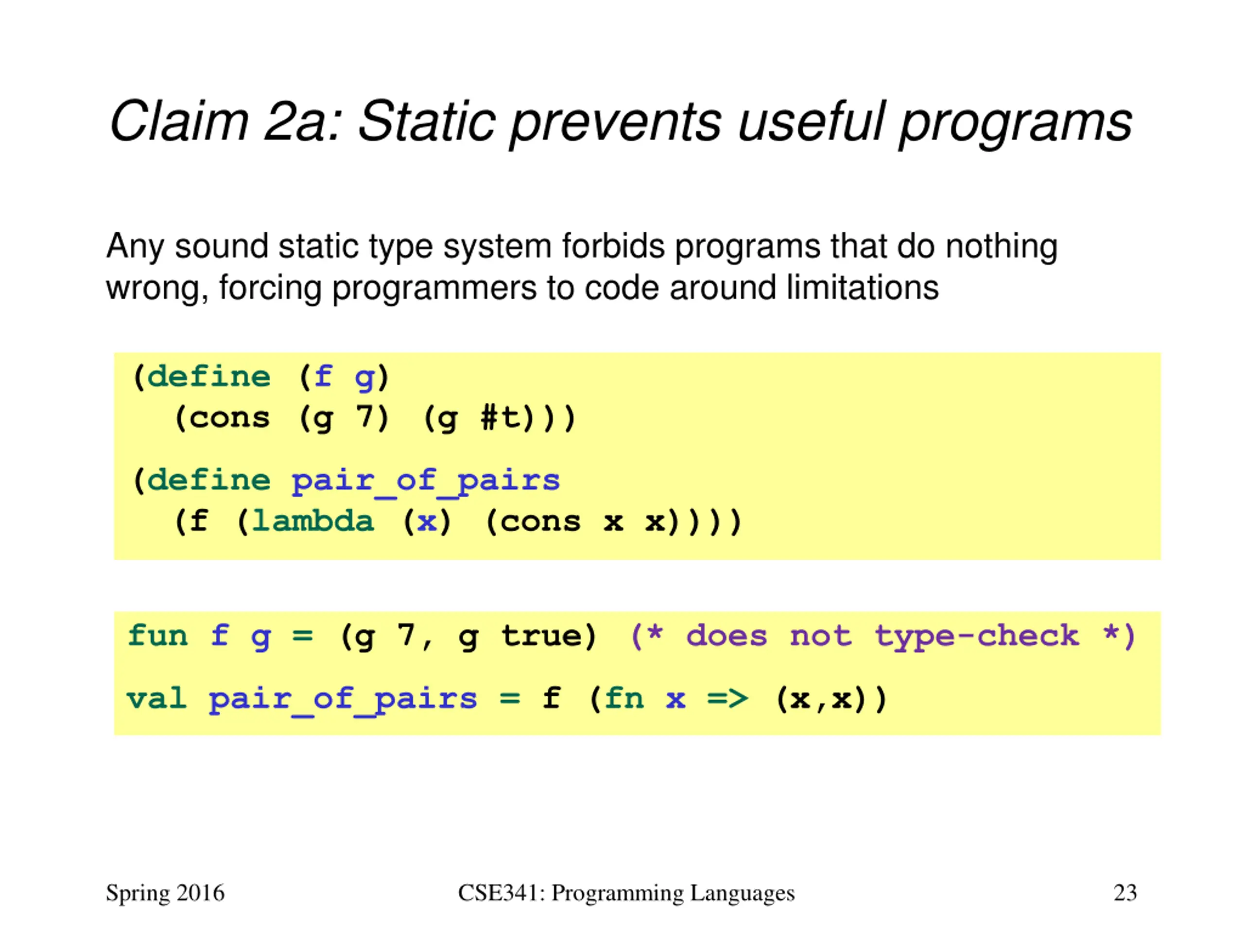 Claim 2a: Static prevents useful programs Any sound static type system forbids programs that do nothing wrong, forcing programmers to code around limitations (define (f g) (cons (g 7) (g #t))) (define pair_of_pairs (f (lambda (x) (cons x x)))) fun f g = (g 7, g true) (* does not type-check *) val pair_of_pairs = f (fn x => (x,x)) Spring 2016 CSE341: Programming Languages 23