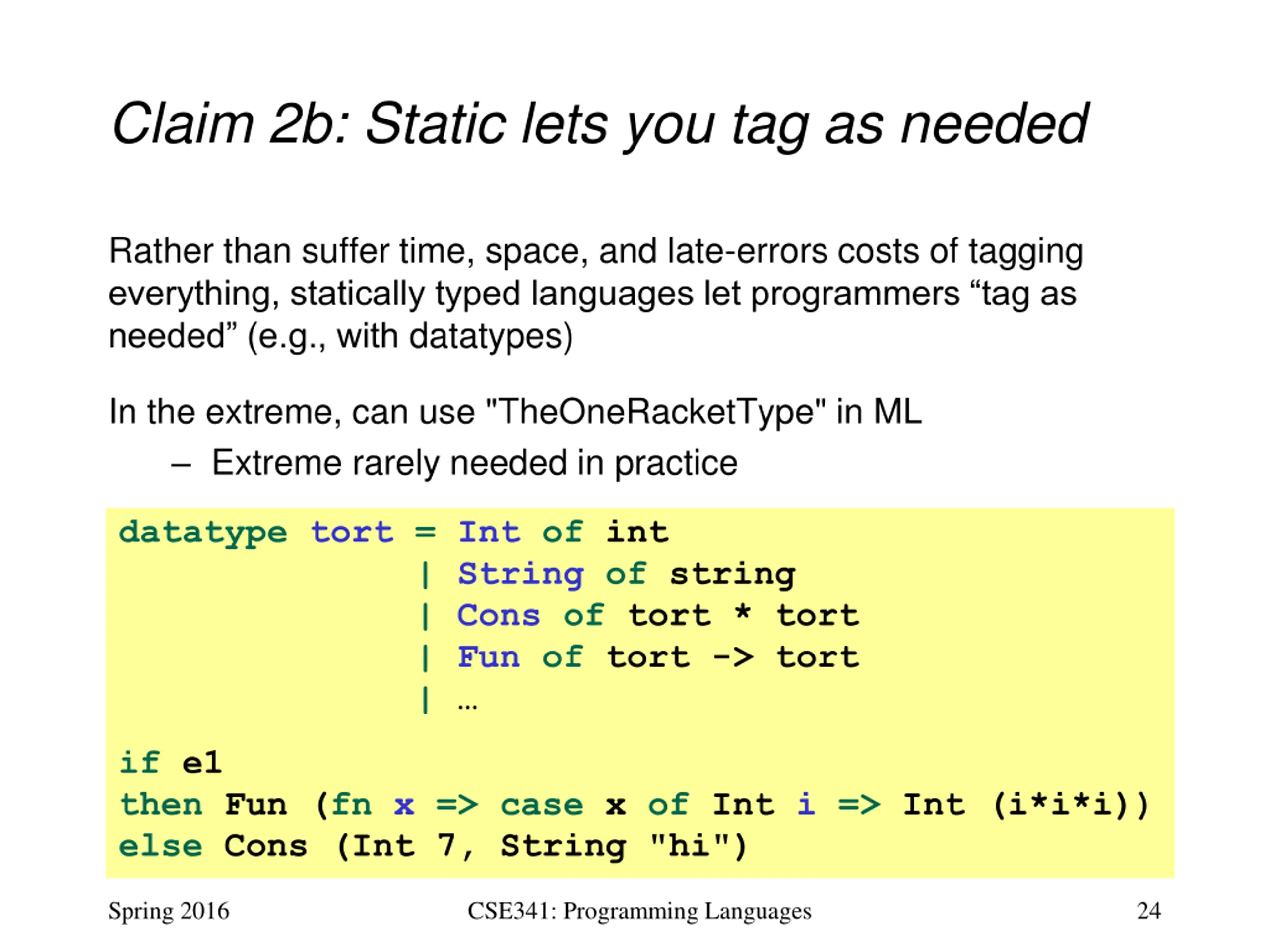 Claim 2b: Static lets you tag as needed Rather than suffer time, space, and late-errors costs of tagging everything, statically typed languages let programmers tag as needed (e.g., with datatypes) In the extreme, can use "TheOneRacketType" in ML Extreme rarely needed in practice datatype tort = Int of int | Cons of tort * tort | Fun of tort -> tort | | String of string if e1 then Fun (fn x => case x of Int i => Int (i*i*i)) else Cons (Int 7, String "hi") Spring 2016 CSE341: Programming Languages 24