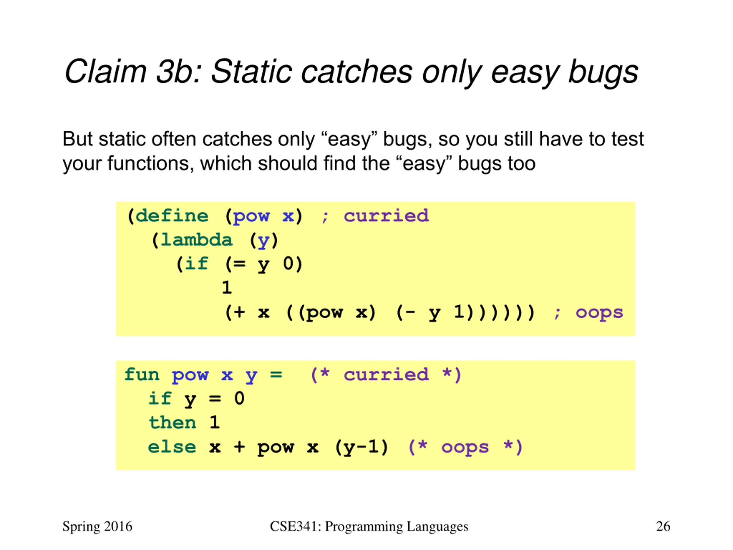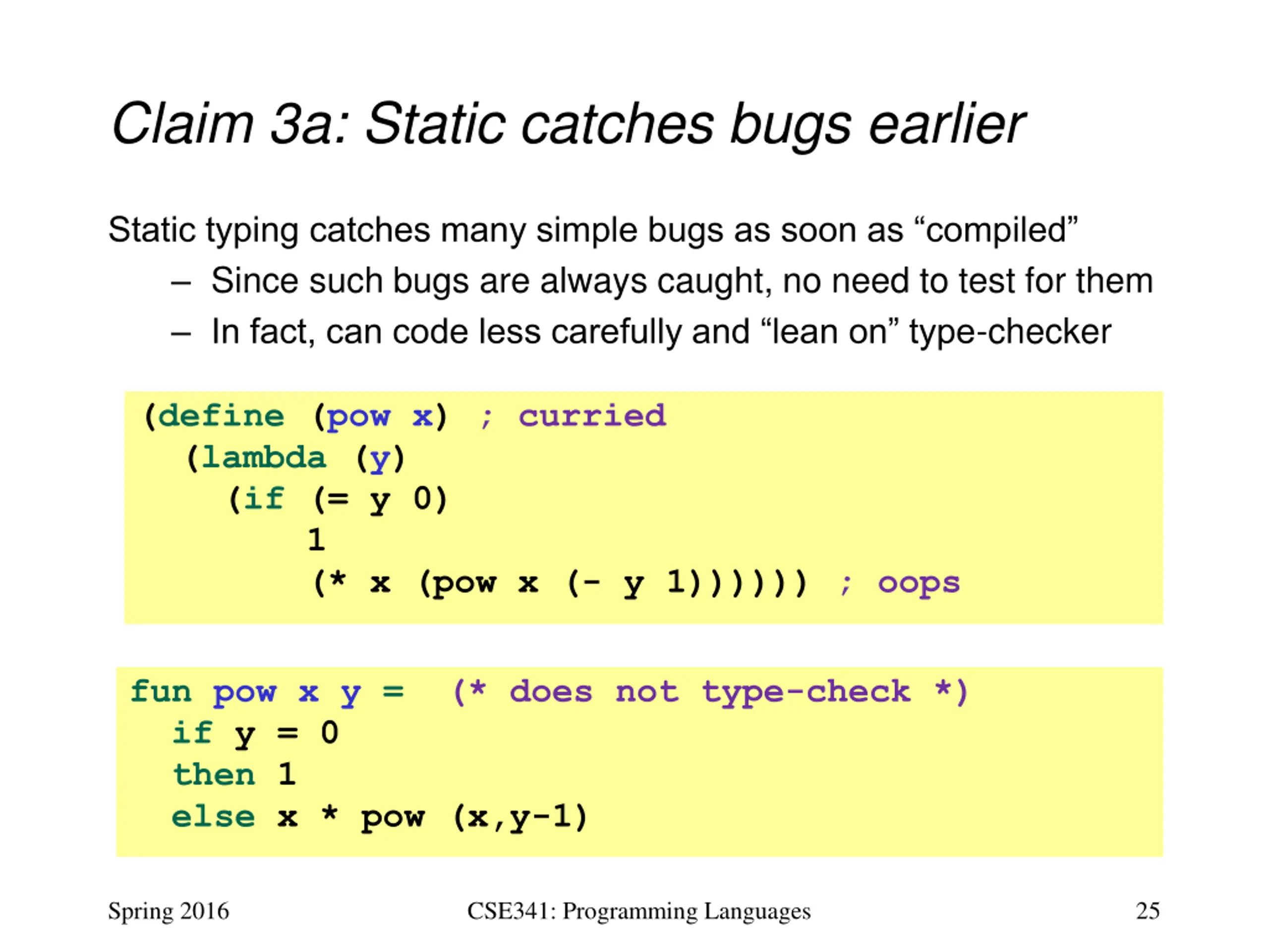 Claim 3a: Static catches bugs earlier Static typing catches many simple bugs as soon as compiled Since such bugs are always caught, no need to test for them In fact, can code less carefully and lean on type-checker (define (pow x) ; curried (lambda (y) (if (= y 0) 1 (* x (pow x (- y 1)))))) ; oops fun pow x y = (* does not type-check *) if y = 0 then 1 else x * pow (x,y-1) Spring 2016 CSE341: Programming Languages 25