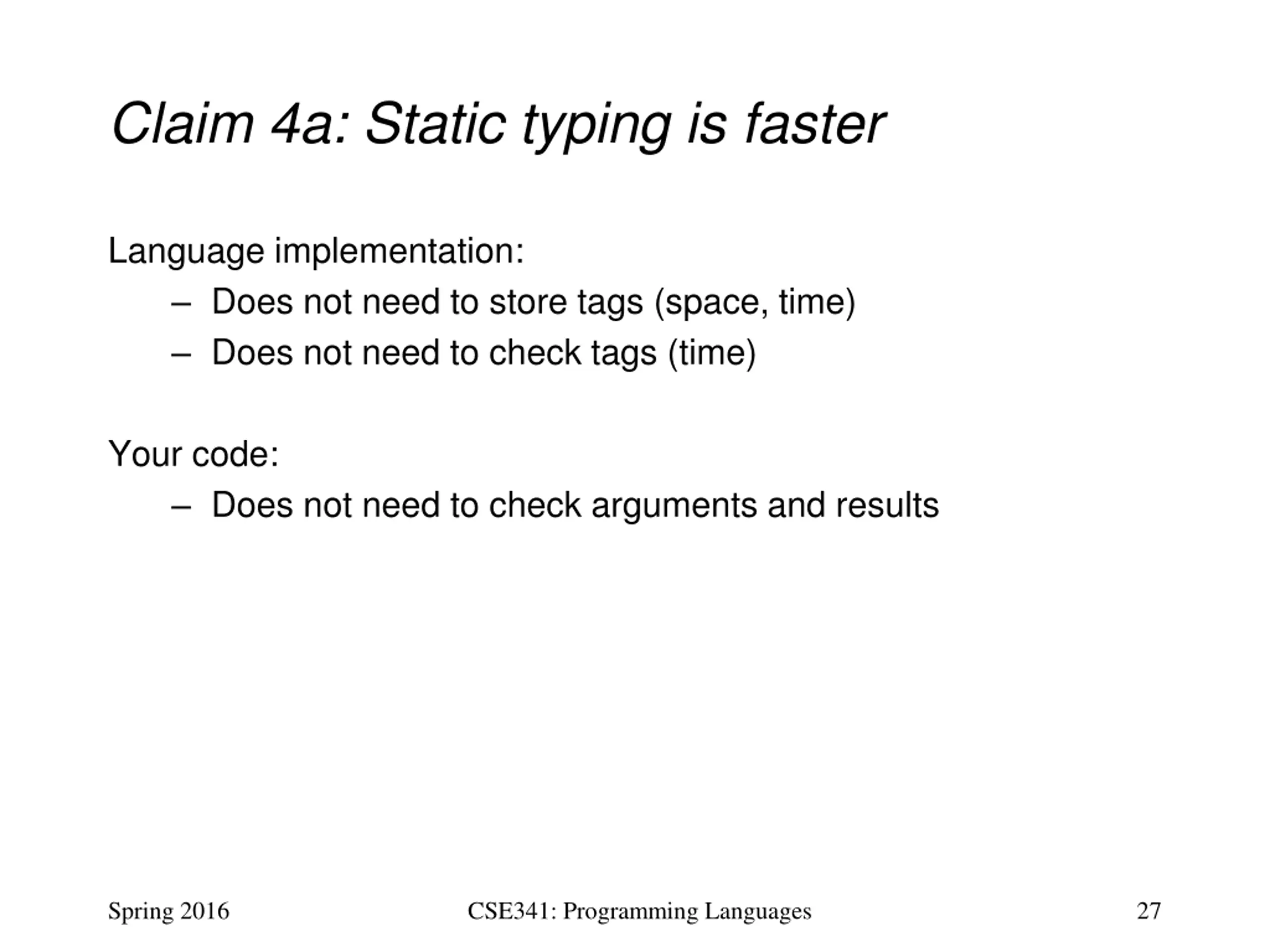 Claim 4a: Static typing is faster Language implementation: Does not need to store tags (space, time) Does not need to check tags (time) Your code: Does not need to check arguments and results Spring 2016 CSE341: Programming Languages 27