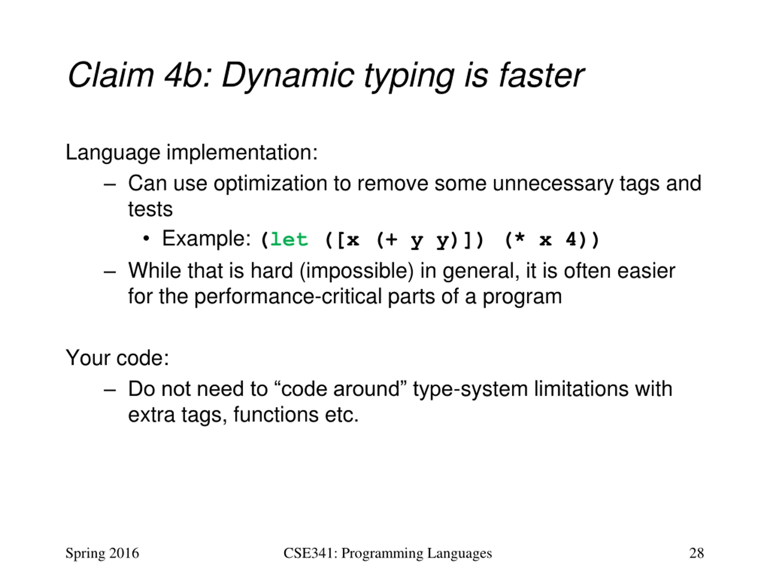 Claim 4b: Dynamic typing is faster Language implementation: Can use optimization to remove some unnecessary tags and tests Example: (let ([x (+ y y)]) (* x 4)) While that is hard (impossible) in general, it is often easier for the performance-critical parts of a program Your code: Do not need to code around type-system limitations with extra tags, functions etc. Spring 2016 CSE341: Programming Languages 28