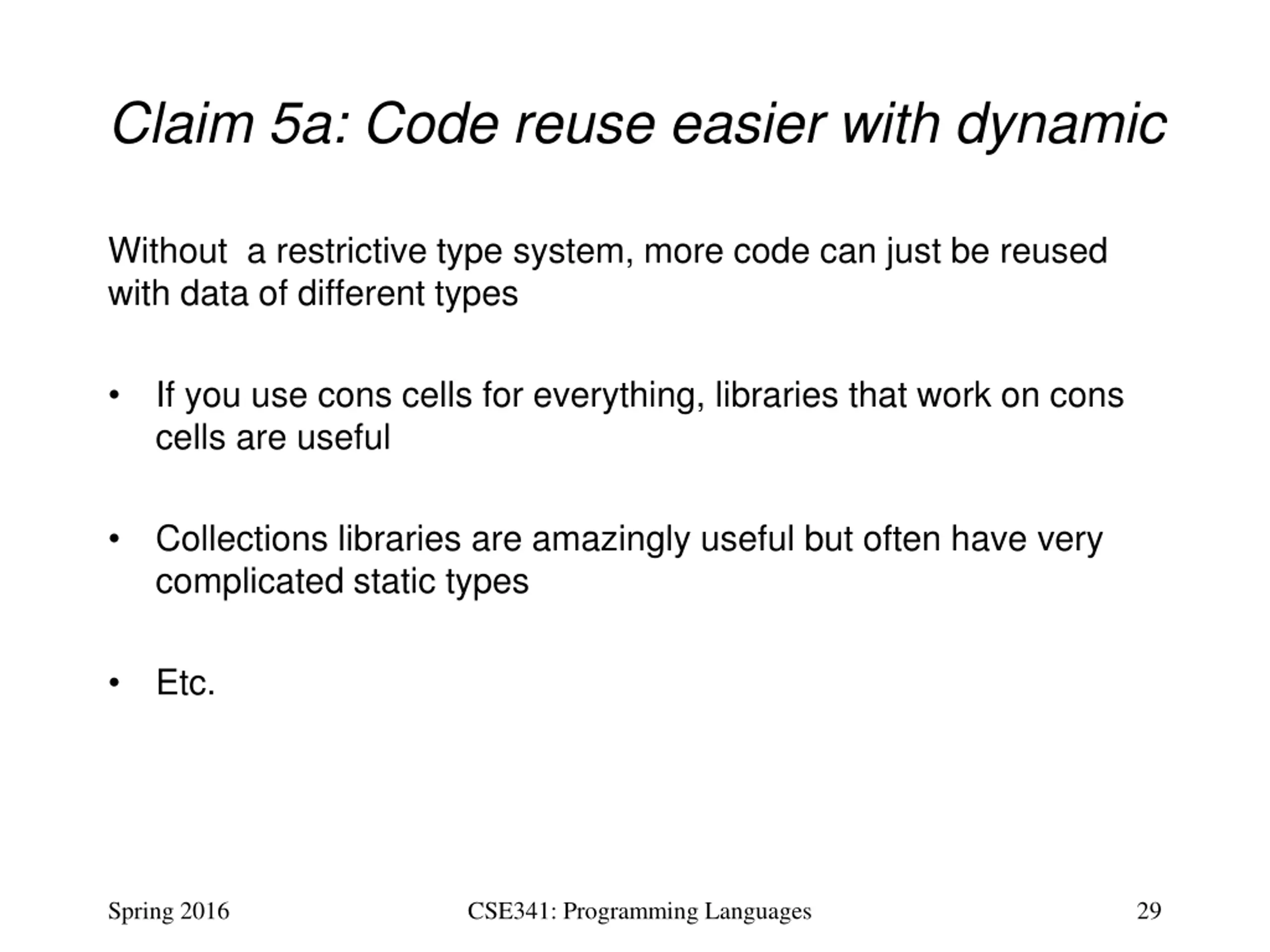 Claim 5a: Code reuse easier with dynamic Without a restrictive type system, more code can just be reused with data of different types If you use cons cells for everything, libraries that work on cons cells are useful Collections libraries are amazingly useful but often have very complicated static types Etc. Spring 2016 CSE341: Programming Languages 29