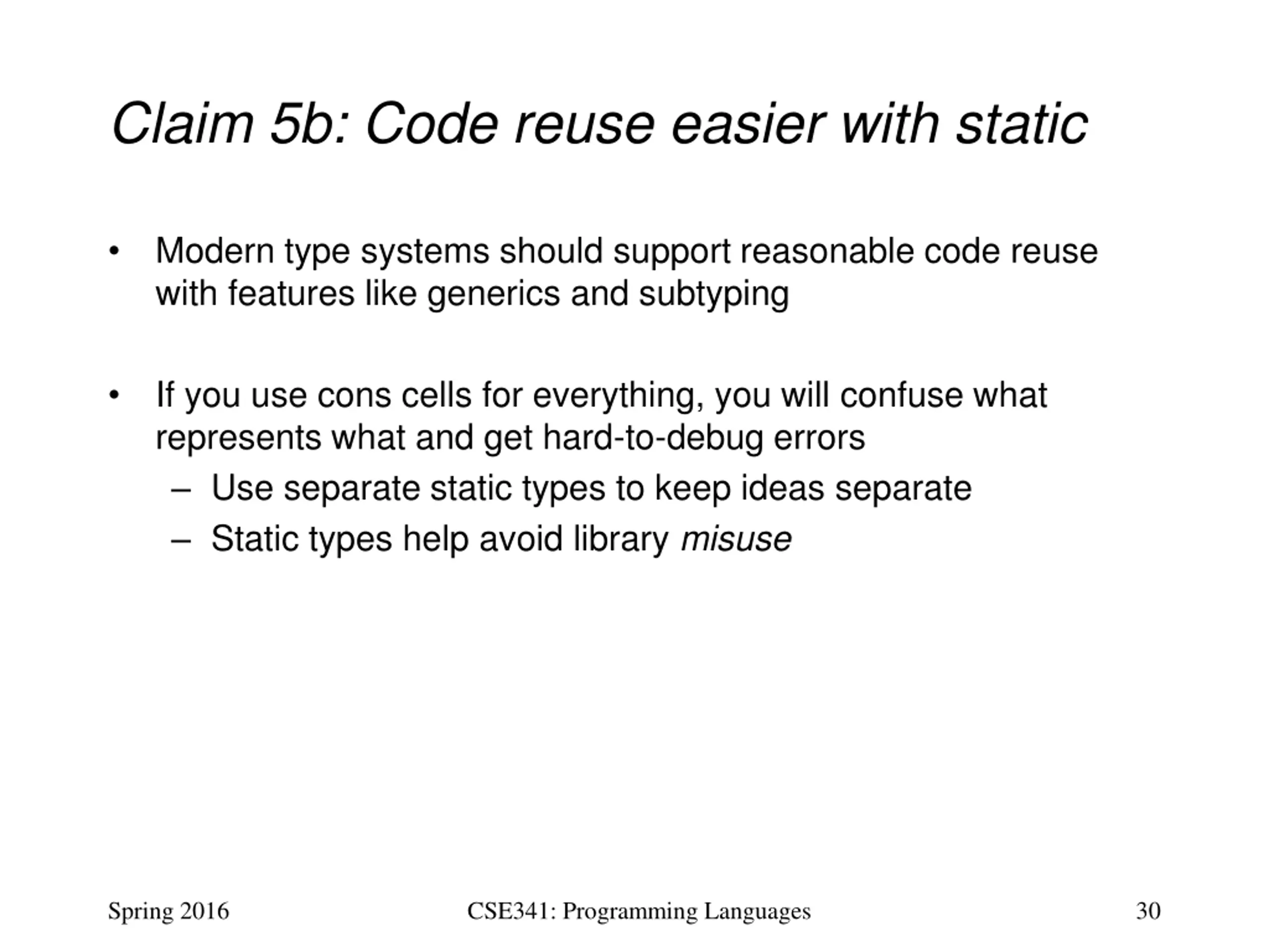 Claim 5b: Code reuse easier with static Modern type systems should support reasonable code reuse with features like generics and subtyping If you use cons cells for everything, you will confuse what represents what and get hard-to-debug errors Use separate static types to keep ideas separate Static types help avoid library misuse Spring 2016 CSE341: Programming Languages 30