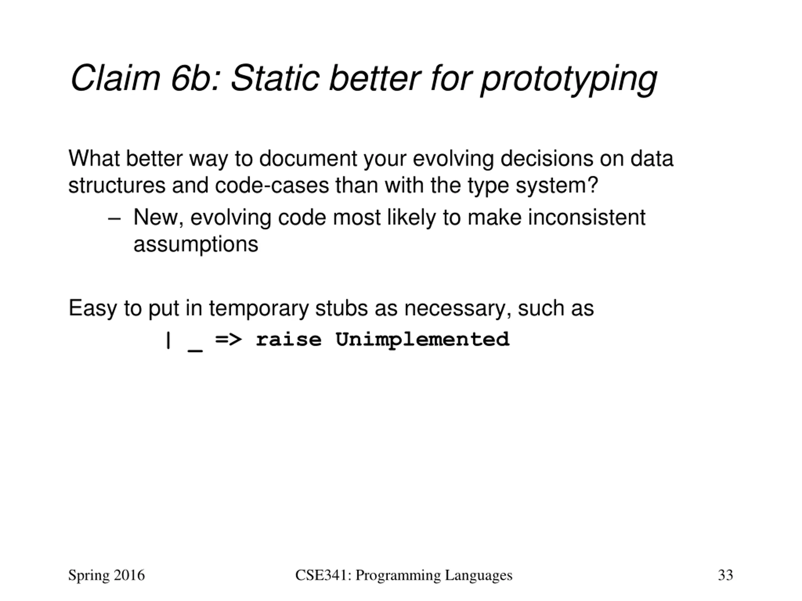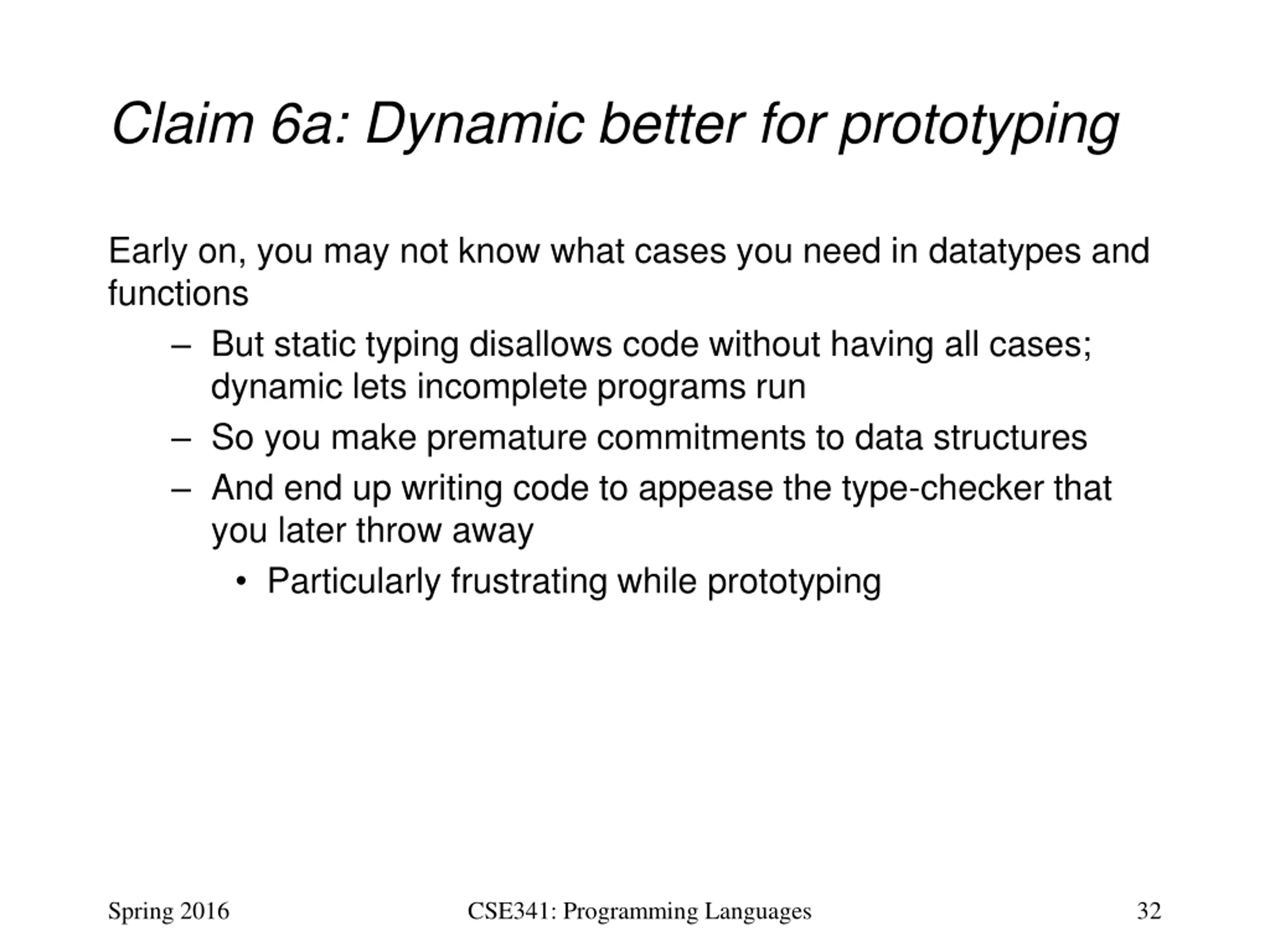 Claim 6a: Dynamic better for prototyping Early on, you may not know what cases you need in datatypes and functions But static typing disallows code without having all cases; dynamic lets incomplete programs run So you make premature commitments to data structures And end up writing code to appease the type-checker that you later throw away Particularly frustrating while prototyping Spring 2016 CSE341: Programming Languages 32