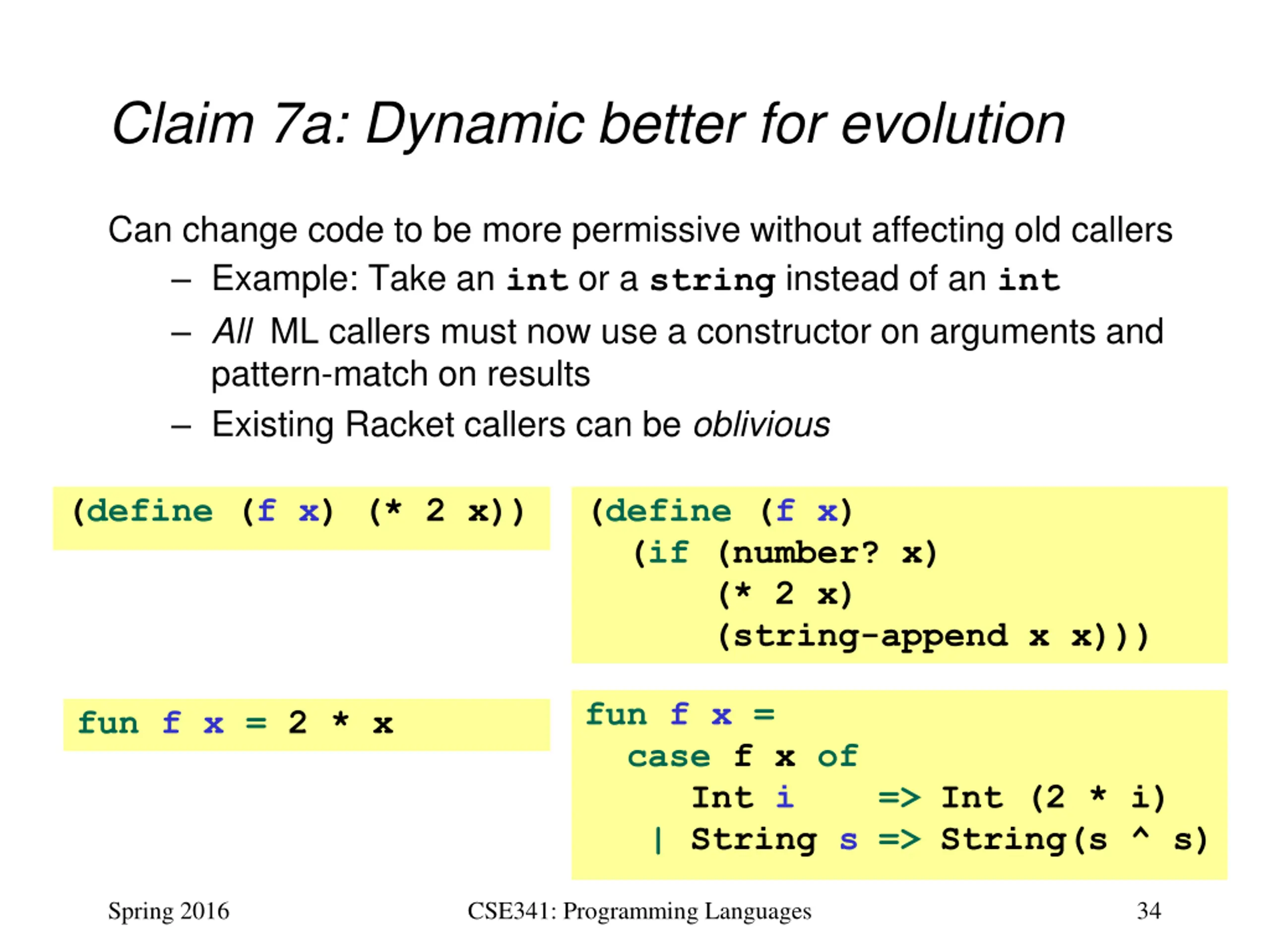 Claim 6b: Static better for prototyping What better way to document your evolving decisions on data structures and code-cases than with the type system? New, evolving code most likely to make inconsistent assumptions Easy to put in temporary stubs as necessary, such as | _ => raise Unimplemented Spring 2016 CSE341: Programming Languages 33