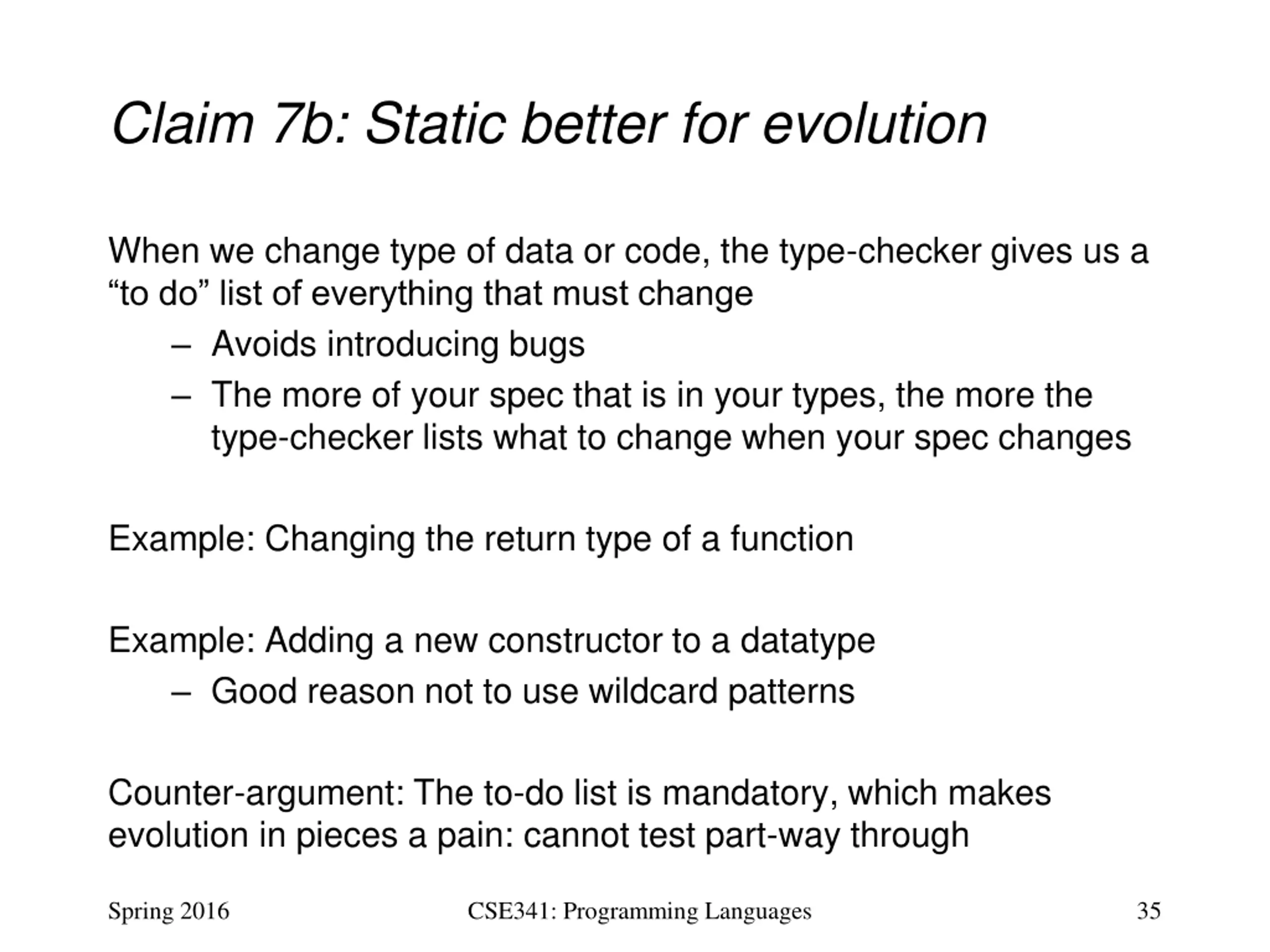 Claim 7b: Static better for evolution When we change type of data or code, the type-checker gives us a to do list of everything that must change Avoids introducing bugs The more of your spec that is in your types, the more the type-checker lists what to change when your spec changes Example: Changing the return type of a function Example: Adding a new constructor to a datatype Good reason not to use wildcard patterns Counter-argument: The to-do list is mandatory, which makes evolution in pieces a pain: cannot test part-way through Spring 2016 CSE341: Programming Languages 35