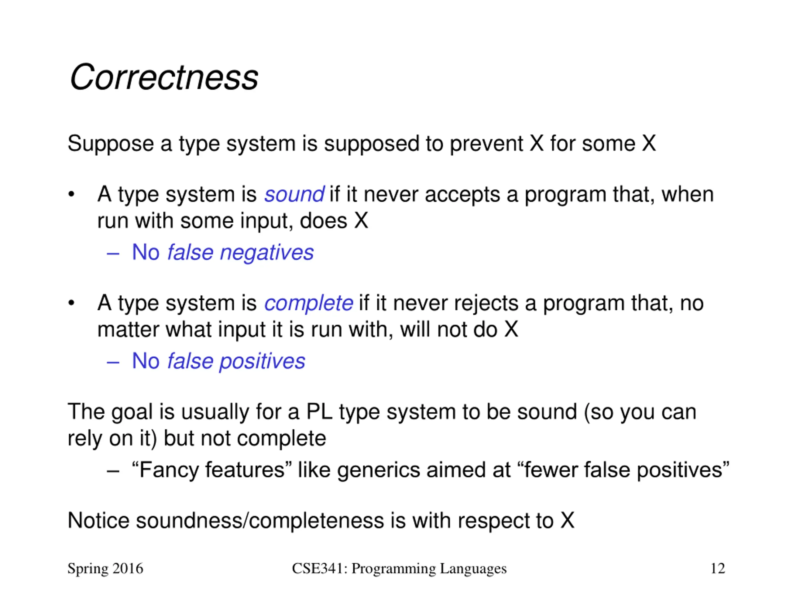 Correctness Suppose a type system is supposed to prevent X for some X A type system is sound if it never accepts a program that, when run with some input, does X No false negatives A type system is complete if it never rejects a program that, no matter what input it is run with, will not do X No false positives The goal is usually for a PL type system to be sound (so you can rely on it) but not complete Fancy features like generics aimed at fewer false positives Notice soundness/completeness is with respect to X Spring 2016 CSE341: Programming Languages 12
