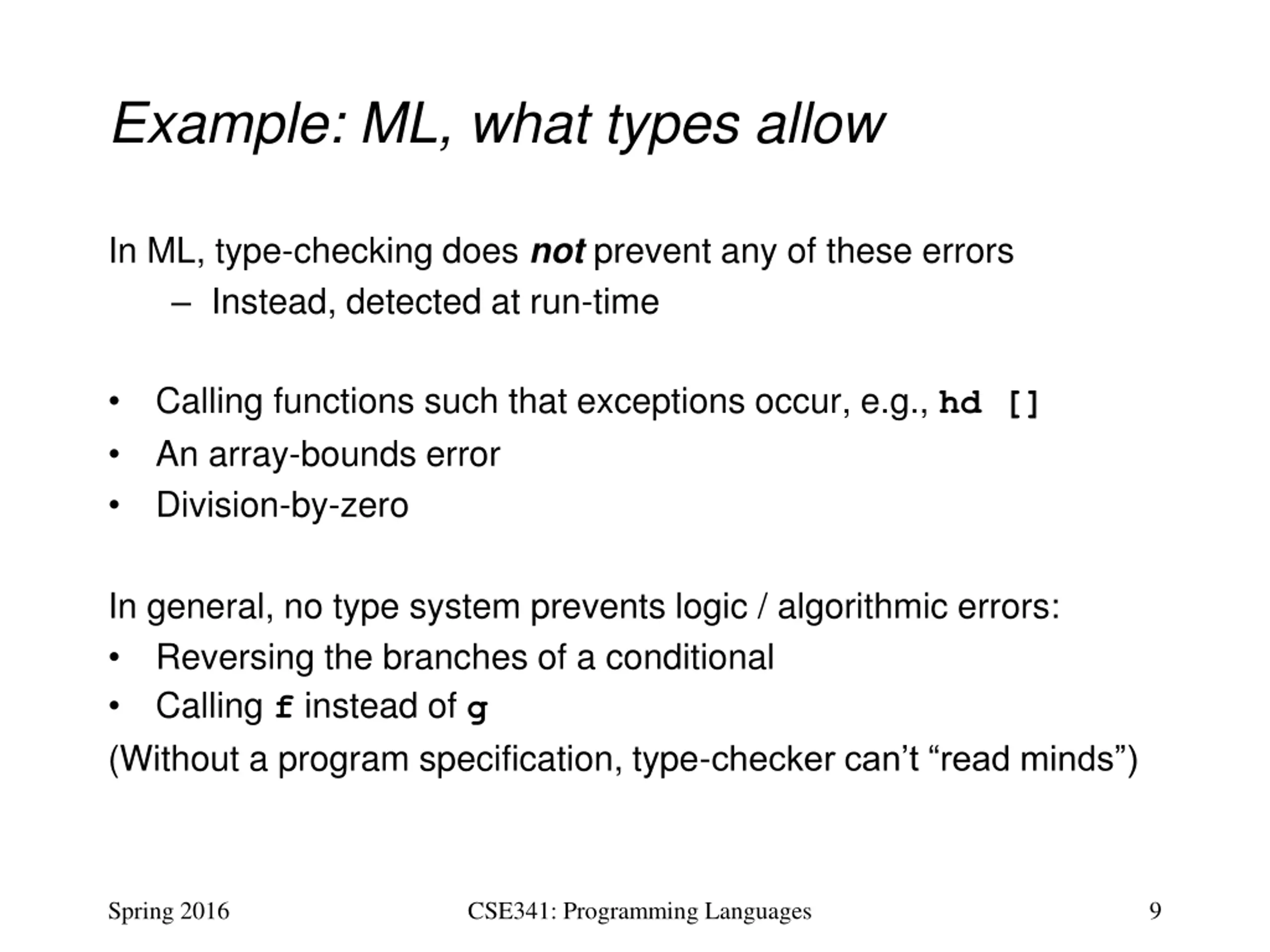 Example: ML, what types allow In ML, type-checking does not prevent any of these errors Instead, detected at run-time Calling functions such that exceptions occur, e.g., hd [] An array-bounds error Division-by-zero In general, no type system prevents logic / algorithmic errors: Reversing the branches of a conditional Calling f instead of g (Without a program specification, type-checker can t read minds ) Spring 2016 CSE341: Programming Languages 9