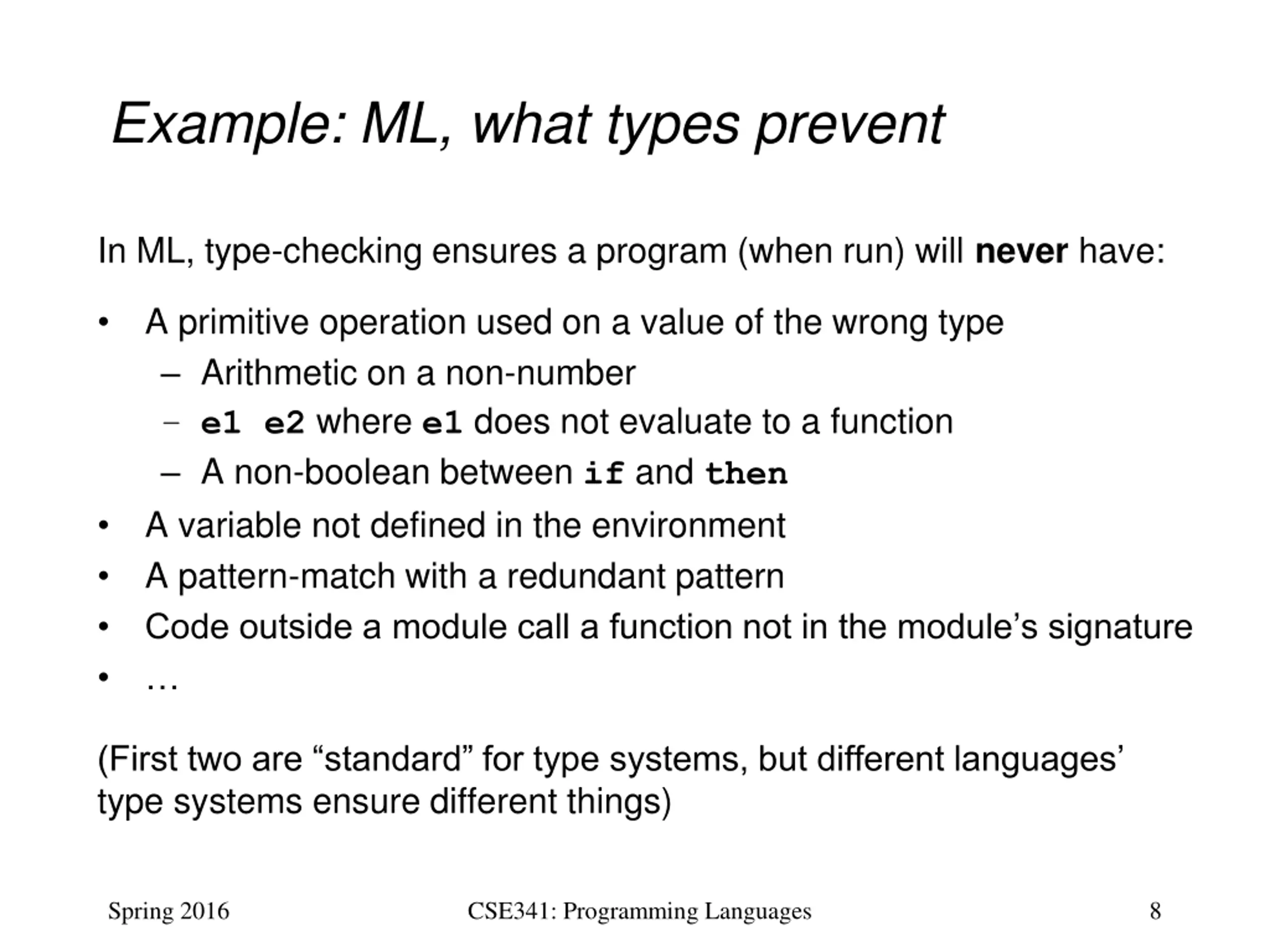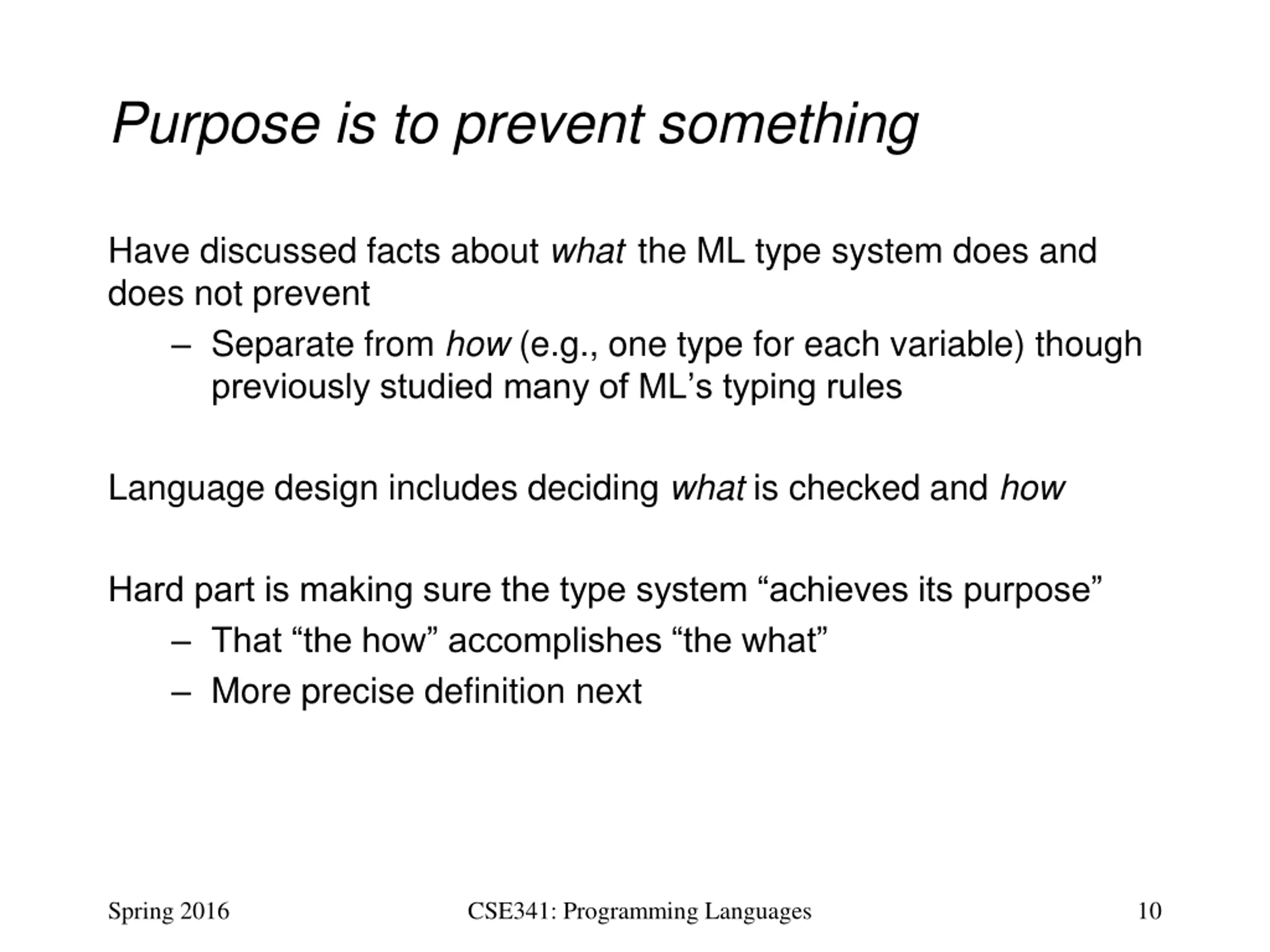 Purpose is to prevent something Have discussed facts about what the ML type system does and does not prevent Separate from how (e.g., one type for each variable) though previously studied many of ML s typing rules Language design includes deciding what is checked and how Hard part is making sure the type system achieves its purpose That the how accomplishes the what More precise definition next Spring 2016 CSE341: Programming Languages 10